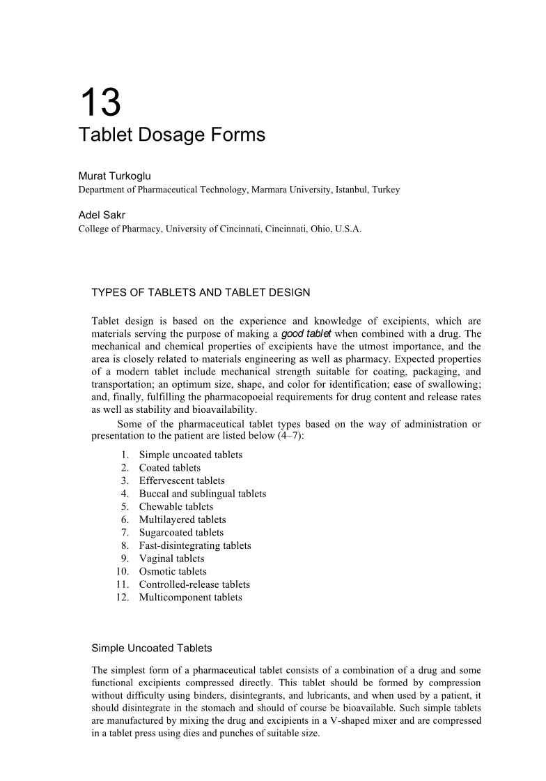 最简单的药片形式是由药物和一些直接压缩的功能性辅料组合而成。这种药片应该通过压缩形成,使用粘合剂、崩解剂和润滑剂不会有困难,当病人使用时,它应该在胃中崩解,当然应该是生物利用度的。这种简单的片剂是通过在V形混合器中混合药物和赋形剂制成的,并使用适当尺寸的模具和冲头在压片机中压缩。