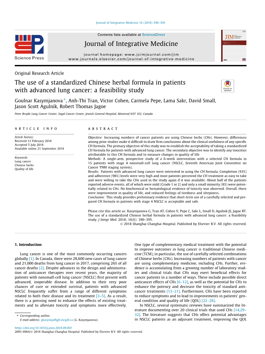 我们选择了一项单臂前瞻性研究设计,以测试在我们中心的4期非小细胞肺癌患者中使用所选中药配方的可行性和可接受性。在缺乏先前数据指导正式把握度计算的情况下,选择了15个样本量。为期6周的干预在蒙特利尔犹太总医院的彼得·布罗迪肺癌中心进行,对4期非小细胞肺癌患者采用了选定的中药方案。犹太总医院是麦吉尔大学的教学医院,而彼得·布罗迪肺癌中心是第三级转诊中心,也是门诊肺癌护理的主要场所。在彼得·布罗迪肺癌中心中,非常强调多学科护理,将最好的药理学、外科和放射疗法与互补的健康方法相结合,包括中医[36]。该研究获得了犹太总医院研究伦理委员会的批准(协议:JGH-14-150;批准日期:2015年12月14日),由加拿大卫生部授权(文件号21257)。