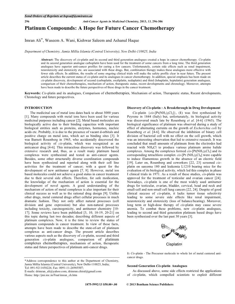 导言:金属离子的药用可以追溯到5000年前[1]。许多金属离子化合物被用于各种医疗用途,包括癌症[2]。金属基分子由于其与蛋白质、酶、激素、核酸等重要生物实体的结合能力而具有生物活性。这可能是由于存在空置的d轨道和金属离子上的正电荷,它们作为结合点[3]。正是Barnett Rosenberg在1965年偶然发现顺铂的生物活性,顺铂被认为是一种抗癌药物[4-6]。这一神奇的发现之后进行了广泛的研究,因此,许多铂基配合物被合成并作为抗癌剂进行了测试。此外,还合成了其他一些结构多样的配位化合物,并报告了它们的细胞线活动,以治疗癌症;寻求开发新的抗癌药物[7,8]。然而,基于金属离子的分子由于其多种副作用,在癌症治疗中未能取得良好的地位。因此,为了安全用药,对作用机制的了解对于新型药物的开发是必不可少的。了解金属配合物的作用机理对其临床疗效和药物的合理设计也很重要[9]。与其他药物不同的是,以金属为中心的药物对细胞过程的影响非常明显。它们不仅影响自然过程(细胞分裂和基因表达),而且影响非自然过程,包括毒性、致癌性和抗肿瘤化学[10-17]。在过去的二十年里,一些评论已经发表了[3,10,18-19,20-21]关于这个主题;描述了铂配合物的不同方面。现在是回顾铂化合物在癌症治疗中的地位的时候了。鉴于这些事实,人们试图将铂配合物的最新发展描述为抗癌药物。本文从顺铂的发现、顺铂的二、三代类似物、铂络合物化学疗法的比较、作用机理、治疗现状以及铂抗癌药物的未来前景等方面进行了论述。