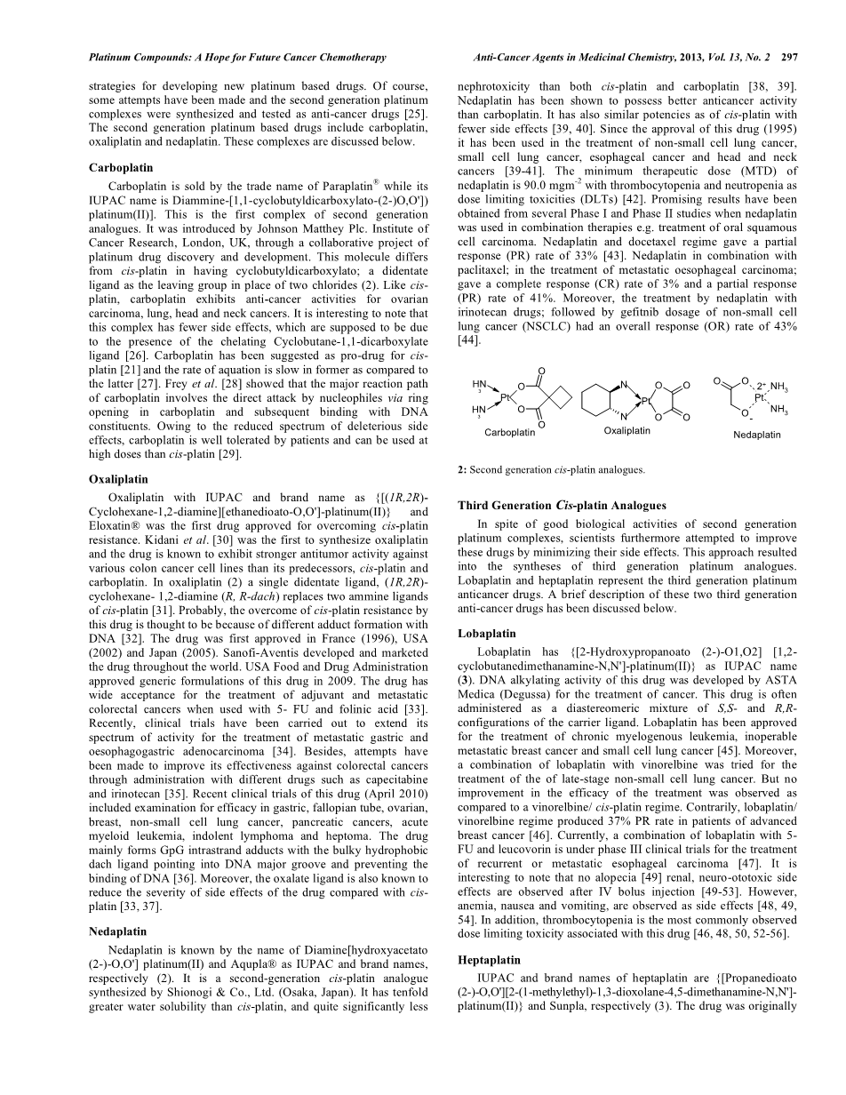 洛铂:洛铂用{2-羟丙酸(2-)-O1,O2][1,2-环丁二胺-N,N#39;]-铂(ii)}作为国际通用名称(3)。该药物的DNA烷基化活性由ASTA Medica(Degussa)开发用于治疗癌症。该药物通常作为载体配体的S,S-和R,R构型的非对映异构体混合物给药。洛巴铂已被批准用于治疗慢性粒细胞白血病,不能手术的转移性乳腺癌和小细胞肺癌。此外,尝试了洛铂与长春瑞滨的组合用于治疗晚期非小细胞肺癌。但与长春瑞滨/顺铂方案相比,未观察到治疗效果的改善。相反,洛铂/长春瑞滨治疗晚期乳腺癌患者的PR率为37%。目前,洛铂与5-FU和甲酰四氢叶酸的组合正在进行III期临床试验,用于治疗复发性或转移性食管癌。值得注意的是,在静脉推注后没有观察到脱发,神经 - 耳毒性副作用。然而,观察到贫血,恶心和呕吐是副作用。此外,血小板减少症是最常见的剂量限制性毒性。