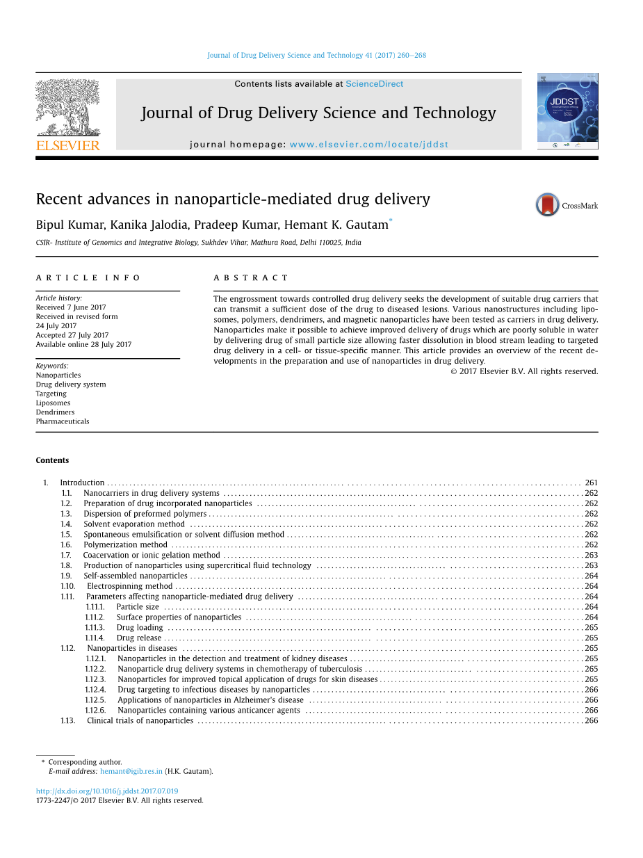 对控制药物输送的引入寻求开发合适的药物载体可以将足够剂量的药物传递给患病的病变部位。已经测试了各种药物递送中的载体,如纳米结构,包括脂质,聚合物,树枝状大分子和磁性纳米颗粒。纳米颗粒通过提供小粒径的药物可以改善在水中难溶的药物的递送,允许在血流中更快地溶解,从而使靶向以细胞或组织特异性方式递送药物。 本文概述了纳米粒子在药物输送中的制备和使用的最新进展。