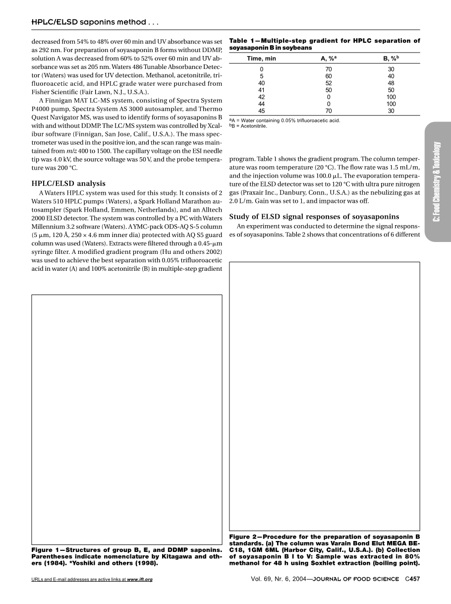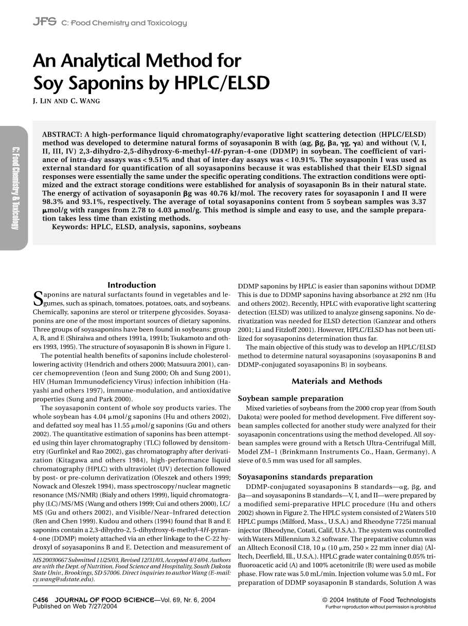 皂苷是存在于蔬菜和豆类中的天然表面活性剂,如菠菜、西红柿、土豆、燕麦和大豆。化学上,皂苷是甾醇或三萜苷。大豆皂苷是膳食皂苷的重要来源之一。大豆中发现了三组大豆皂苷:A组、B组和E组(Shiraiwa等1991a、1991b;和其他1993年,1995年)。大豆皂苷B的结构如图1所示。皂苷的潜在健康益处包括降低胆固醇的活性(Hendrich和其他2000;《癌症化学预防》(全与宋,2000;Oh和Sung(2001)、HIV(人类免疫缺陷病毒)感染抑制(Hayashi和其他人1997)、免疫调节和抗氧化特性(Sung和Park 2000)。全豆制品中大豆皂苷的含量各不相同。整个大豆中含有4.04 mol/g皂苷(胡等,2002),脱脂豆粕中含有11.55 mol/g皂苷(Gu等,2002)。采用薄层色谱法(TLC)、密度法(Gurfinkel and Rao 2002)、衍生化后的气相色谱法(Kitagawa等1984)、紫外(UV)检测的高效液相色谱法(HPLC)和柱前或柱后衍生化法(Oleszek等1999)对皂苷进行了定量估计;noack and Oleszek 1994),质谱/核磁共振(MS/NMR) (Bialy等1999),液相色谱(LC)/MS/MS (Wang等1999);崔和其他人2000),LC/ MS(顾和其他人2002),以及可见光/近红外探测(任和陈1999)。Kudou等(1994)发现B和E皂苷中含有2,3-二氢- 2,5 -二羟基-6-甲基- 4h -吡喃4-酮(DDMP)部分,通过醚键连接到大豆皂苷B和E的C-22羟基上采用高效液相色谱法测定DDMP皂苷比不加DDMP的皂苷更容易提取。这是由于DDMP皂苷在292nm处具有吸光度(胡和其他2002年)。近年来,采用蒸发光散射检测器(ELSD)对人参皂苷进行了分析。ELSD检测不需要衍生化(Ganzear等,2001;李和菲茨洛夫2001)。然而,到目前为止,HPLC/ELSD还没有被用于大豆皂苷的测定。本研究的主要目的是建立HPLC/ELSD法测定大豆中天然大豆皂苷(大豆皂苷B和ddmp -偶联大豆皂苷B)的含量。