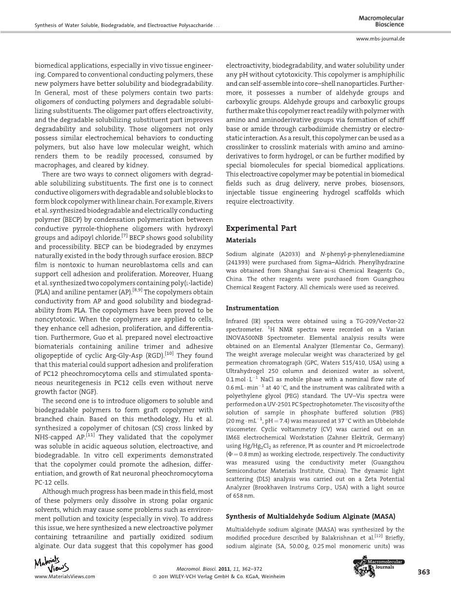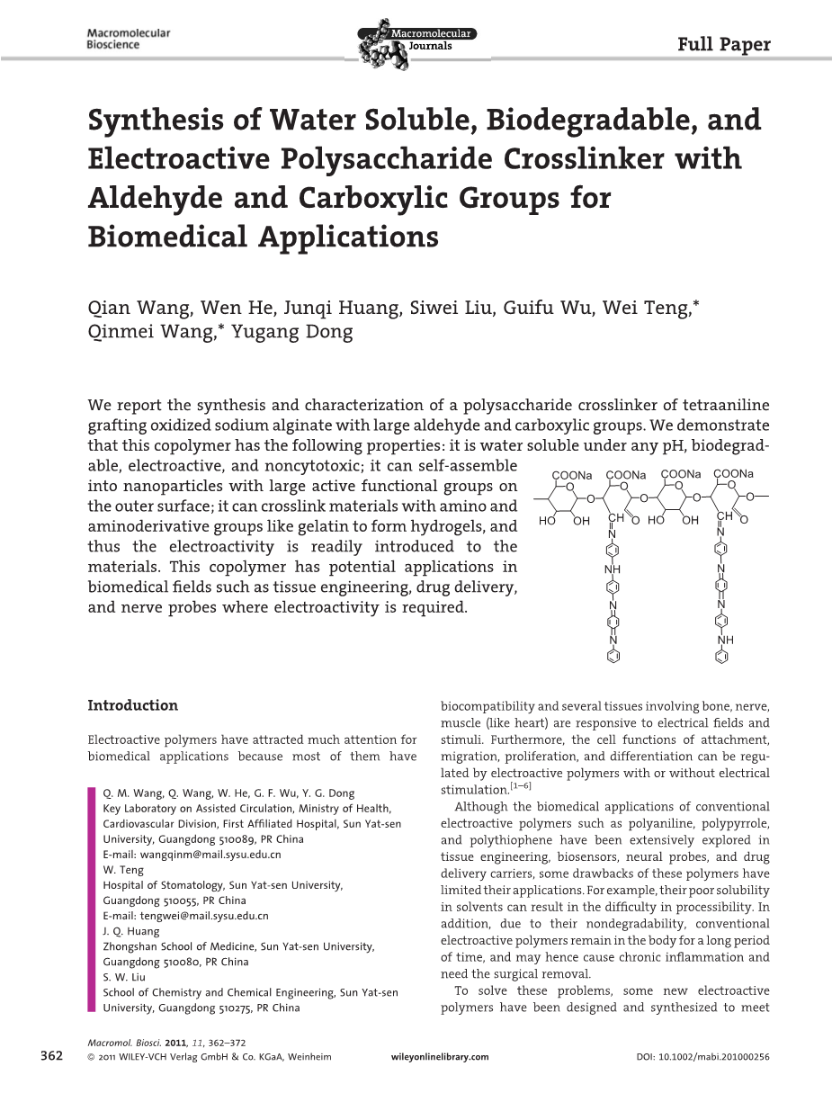 尽管在这个领域已经取得了很大的进步,但是这些聚合物中的大部分仅溶于强极性有机物溶剂,这可能会导致一些问题,如环境污染和毒性(特别是体内)。对于个问题,我们在这里合成了一种新型的聚合物含有四苯胺和部分氧化的钠藻酸盐,我们的数据表明这种共聚物具有很好电活性,生物降解性和任何PH下的水溶性,无细胞毒性。该共聚物是两亲性的并自己组装成核-壳纳米粒子。此外,它具有许多醛基和羧基,醛基和羧基进一步的使这种共聚物更容易与具有氨基和氨基转移基团的聚合物通过形成希夫碱或酰胺通过碳二亚胺化学或静电相互作用。结果,该共聚物可以用作一种交联剂与氨基和氨基衍生物交联材料以形成水凝胶,或可以进一步改性作为用于特殊生物医学应用的特殊生物分子。这种电活性共聚物在生物医学中的药物递送领域,神经探针,生物传感器,注射组织工程水凝胶支架等需要电活性的领域具有潜在价值。