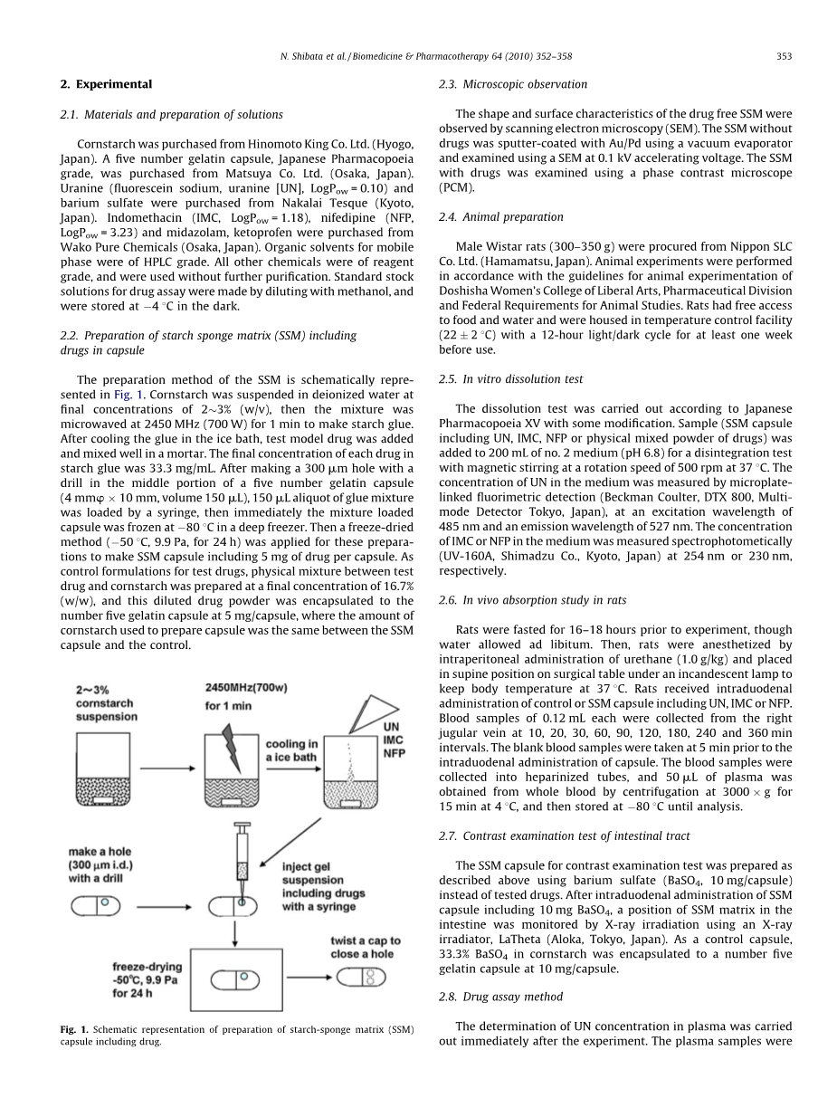 通常,玉米淀粉用作药物赋形剂来制备片剂或胶囊。此外,已经广泛研究了天然淀粉和化学改性淀粉如取代淀粉酶[5],交联淀粉酶[6],淀粉乙酸盐[7]或淀粉糊精[8]作为片剂的直接压片缓释赋形剂。热预胶化淀粉也证明适用于配制亲水基体[9-11]。这项研究的目的是评估一种新的控释胶囊,包括胶囊中的淀粉 - 海绵基质(SSM)。由玉米淀粉制成的SSM被认为是提供持续或控释药物的支持性结构。我们展示了如何制备含有SSM的持续释放胶囊,然后评估SSM胶囊的体外释放行为和药物在大鼠体内的药代动力学特征。选择萤光素钠,吲哚美辛和硝苯地平作为SSM胶囊的模型药物,并对SSM胶囊的粘膜粘附性进行了检测。