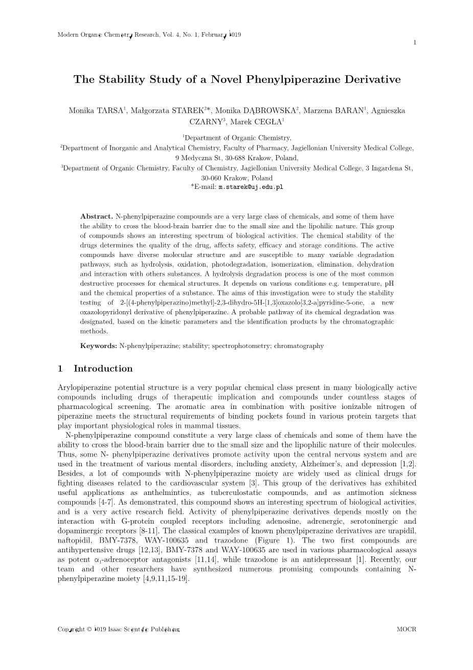 如果我们能够根据药物的结构预测药物的化学不稳定性,这些研究结果将是有用的。本次研究旨在获得通过6-溴-2-吡啶酮与1-(2,3-环氧丙基)-4-苯基哌嗪的反应合成[27]含有N-苯基哌嗪部分的2-[(4-苯基哌嗪基)甲基]-2,3-二氢-5H-[1,3]恶唑并[3,2-a]吡啶-5-酮的更有效的药物。因此,与生物学测试同时进行,确定了一系列新的潜在alpha;-肾上腺素能受体配体候选物的稳定性。从化学角度来看,所研究的化合物是苯基哌嗪的恶唑并吡啶基衍生物(图2)。以前的报道描述了合成对肾上腺素能受体的亲和力和一些物理化学性质[19],但没有关于在碱性或酸性介质中可能的催化水解的报道。