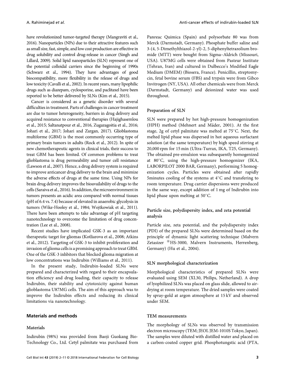 采用热高压均质化(HPH)方法制备SLN (Mehnert and Mader, 2001)。在fi阶段,棕榈酸十六烷基酯的2g在75℃熔融。接下来,t融化脂质相分散在热surfacta水溶液(在同一温度)高速搅拌15分钟20000 rpm (UItra-Turrax, IKA T25,德国获得pre-emulsion随后homogeniz在80 c,使用高压均质器(IK LABORPILOT 2000酒吧,德国),执行5 homo enization周期。系统在49℃冷却5分钟后,转移至室温,得到颗粒。药物载体分散体除在50℃熔解时在脂相中加入1 mg靛玉红外,均以同样的方法制备。