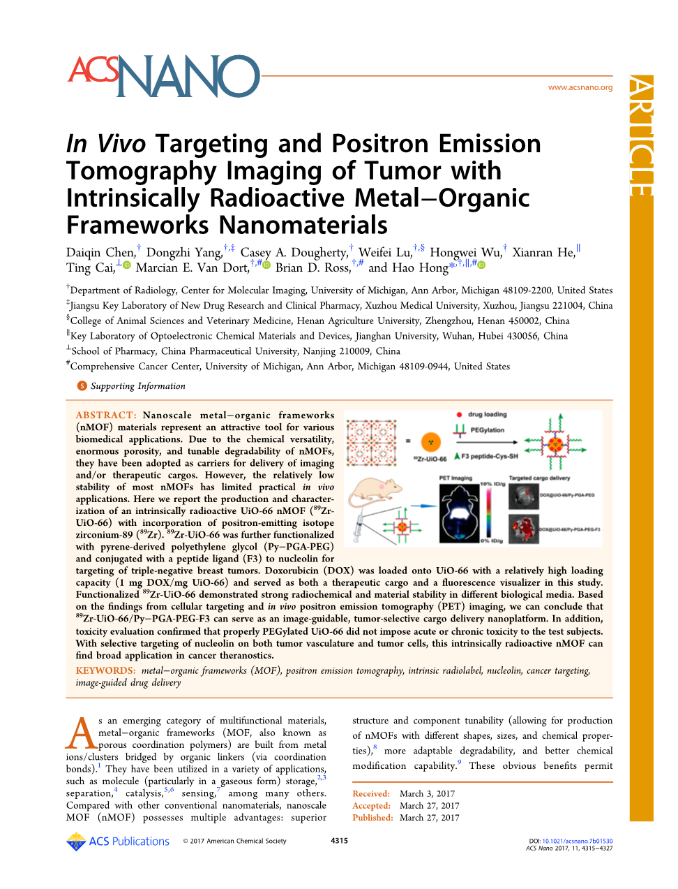 摘要:纳米金属有机骨架材料是一种具有广泛应用前景的生物医用材料。由于NMOF的化学多功能性、巨大的多孔性和可调降解性,它们已被用作传输成像和/或治疗货物的载体。然而,大多数nmofs的相对较低稳定性限制了其在体内的实际应用。在这里,我们报告了一种具有放射性的uio-66 nmof(89zr-uio-66)的生产和特征,其中加入了发射正电子的同位素锆-89 io-66,进一步实现了功能化与芘衍生聚乙二醇(py-pga-peg)结合并与一个肽配体(f3)结合到核苷上,用于三阴性乳腺肿瘤的靶向治疗。阿霉素(DOX)以较高的载药量(1 mg DOX/mg UIO-66)加载到UIO-66上,作为本研究的治疗载体和荧光观察仪。功能化89ZR-UIO-66在不同的生物介质中表现出较强的放射化学和材料稳定性。根据细胞靶向和体内正电子发射断层扫描(PET)成像的结果,我们可以得出89ZR-UIO-66/PY-PGA-PEG-F3可以作为一种可引导肿瘤的选择性载物纳米平台。此外,毒性评估证实,适当聚乙二醇化的uio-66不会对受试者产生急性或慢性毒性。这种固有放射性的NMOF选择性靶向肿瘤血管和肿瘤细胞,在肿瘤治疗中有着广泛的应用。
