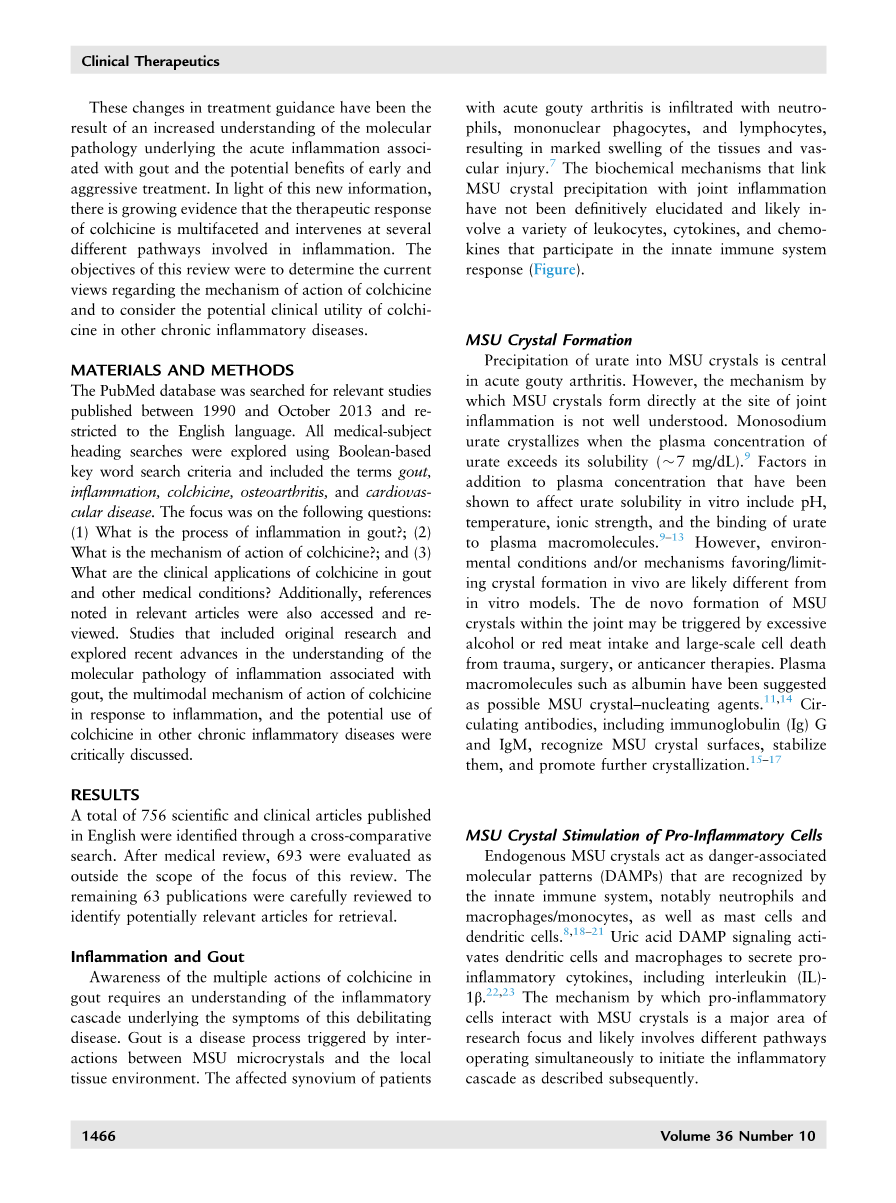 意识到痛风中秋水仙碱的多种作用需要了解这种使人衰弱的疾病症状的潜在炎症级联。痛风是由MSU微晶与局部组织环境之间的相互作用触发的疾病过程。急性痛风性关节炎患者的受累滑膜浸润有中性粒细胞,单核吞噬细胞和淋巴细胞,导致组织明显肿胀和血管损伤。7MSU晶体沉淀与关节炎症的生化机制尚未得到明确阐明,可能涉及参与先天免疫系统反应的各种白细胞,细胞因子和趋化因子。