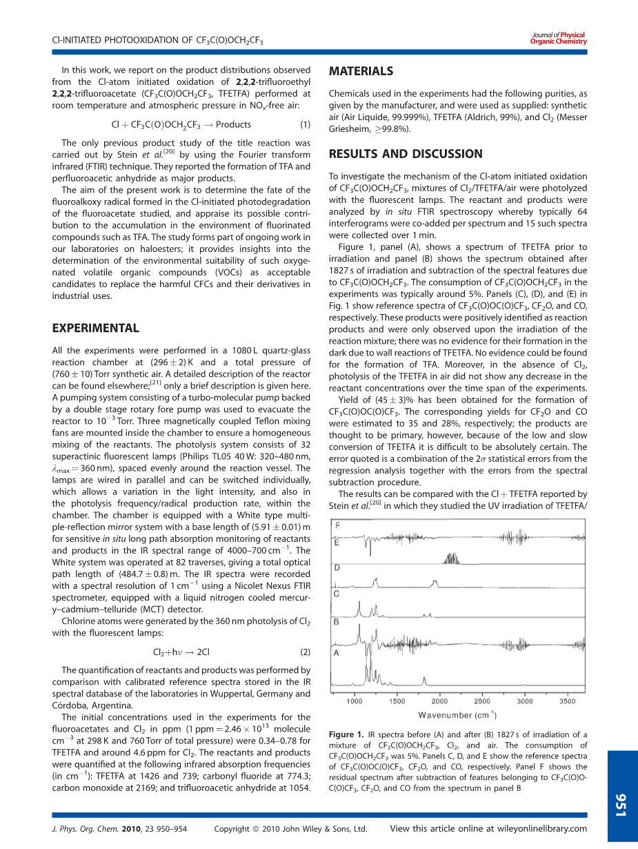 本实验在配备原位傅里叶变换红外光谱检测仪的1080L环境舱内研究氯原子与2,2,2-三氟乙基-2,2,2-三氟乙酸酯(TFETFA;CF3C(O)OCH2CF3)的产物分布和反应机理。该实验在(296plusmn;2)开尔文、大气压为(760plusmn;10)托的不含氮氧化物的人造空气中进行。得到的CF3C(O)O C(O)CF3的收率为(45plusmn;3)%,生成的CF2O和CO的粗略收率分别为35%和28%,没有观察到三氟乙酸(TFA;CF3C(O)OH)。根据脱氢过程中形成氟代烷氧自由基的竞争反应方式:(a)与氧气反应,(b)碳碳键、碳氧键、碳氢键的分解和(c)一种可能的ɑ-酯重排路径,本实验得到的收率结果是合理的。生成三氟乙酸的过程中ɑ-酯重排的五元环过渡态的稳定性减小可以解释ɑ-酯重排方式的可能性很小。本实验还讨论了产物对大气的影响,特别是含氟羧酸的形成对大气的影响。版权所有2010 John Wileyamp;Sons。