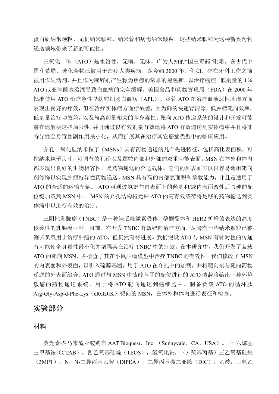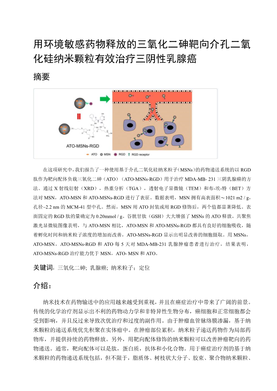 - 用环境敏感药物释放的三氧化二砷靶向介孔二氧 化硅纳米颗粒有效治疗三阴性乳腺癌外文翻译资料