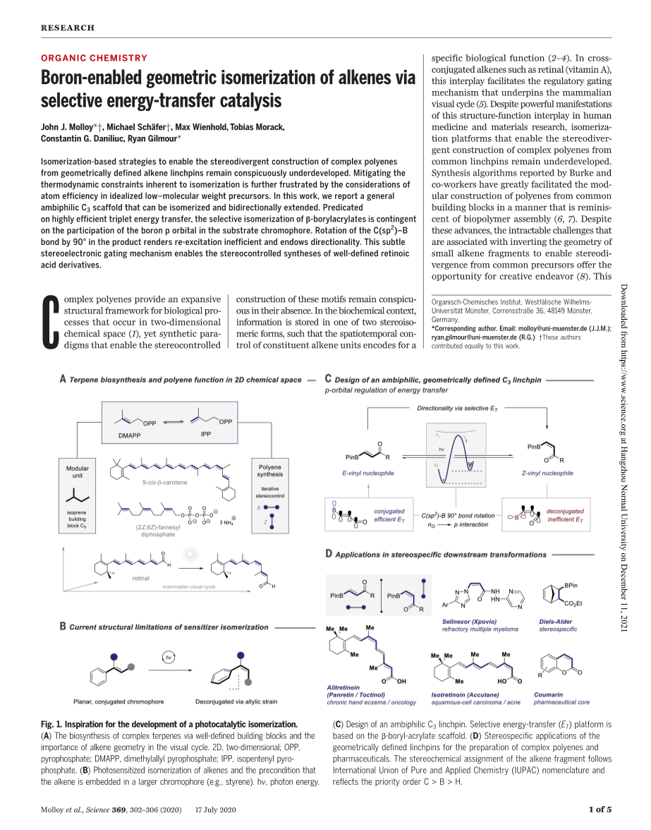 复杂的多烯为发生在二维化学空间中的生物过程提供了一个广阔的结构框架(1),然而使这些图案的立体控制结构成为可能的合成范例依旧很缺少。在生化环境中,信息以两种立体异构体之一的形式存储,比如组成烯烃单元的时空控制可以编码特定的生物功能(2–4).。在交联烯烃如视黄醛(维生素A)中,这种相互作用促进了调节门控机制,支撑着哺乳动物的视觉循环(5)。尽管这种结构-功能相互作用在人类医学和材料研究中有强有力的表现,异构化平台使普通关键环形成复杂多烯的立体发散结构依旧没有发展。Burke和他的同事报告的合成算法极大地促进了多烯的模块构建,是从常见的积木块中发现,以一种让人联想起生物聚合物组装的方式(6, 7)。尽管有这些进展,使反转小烯烃碎片的几何形状与共同前体产生立体发散,这一棘手的挑战为创造性的努力提供了机会(8)。