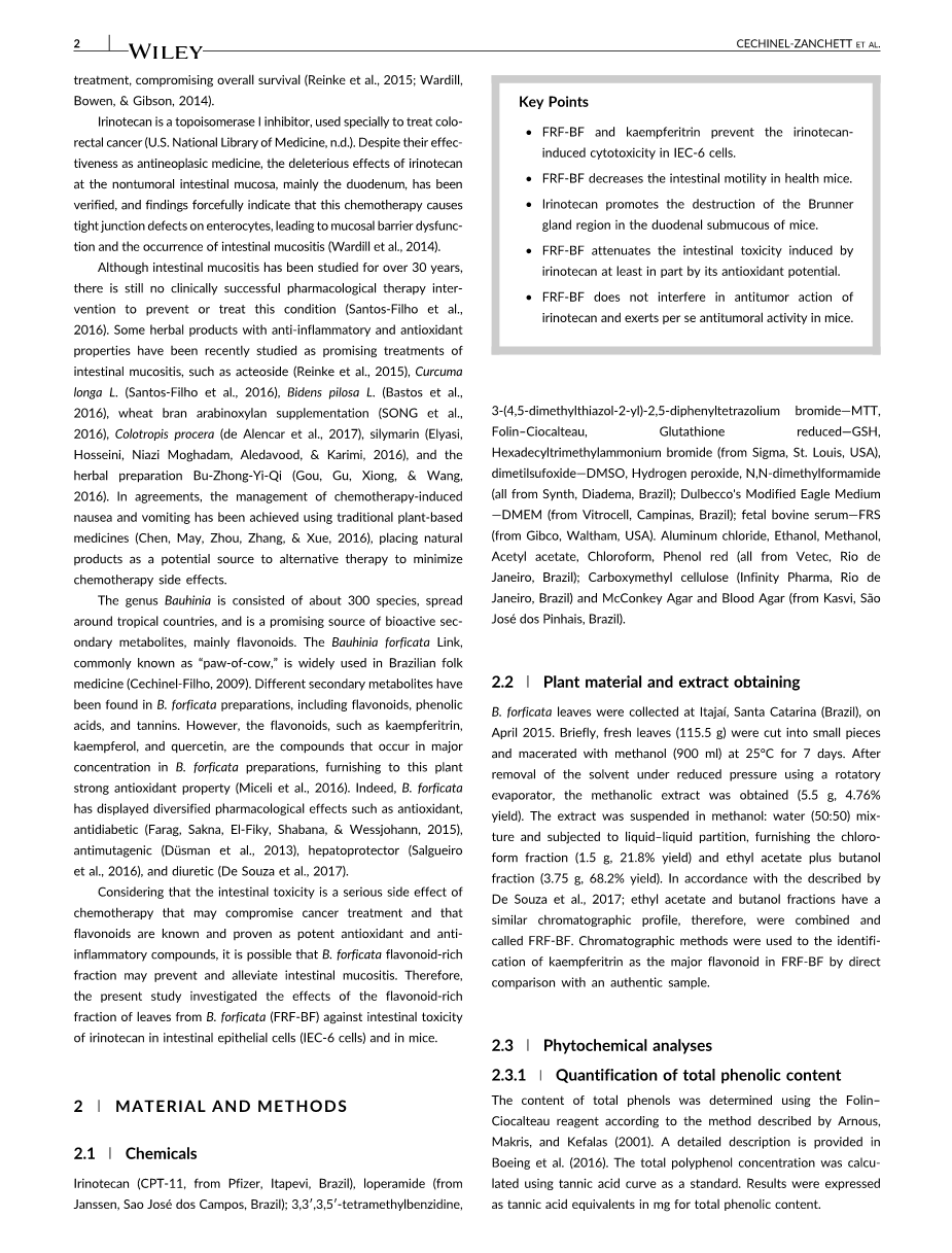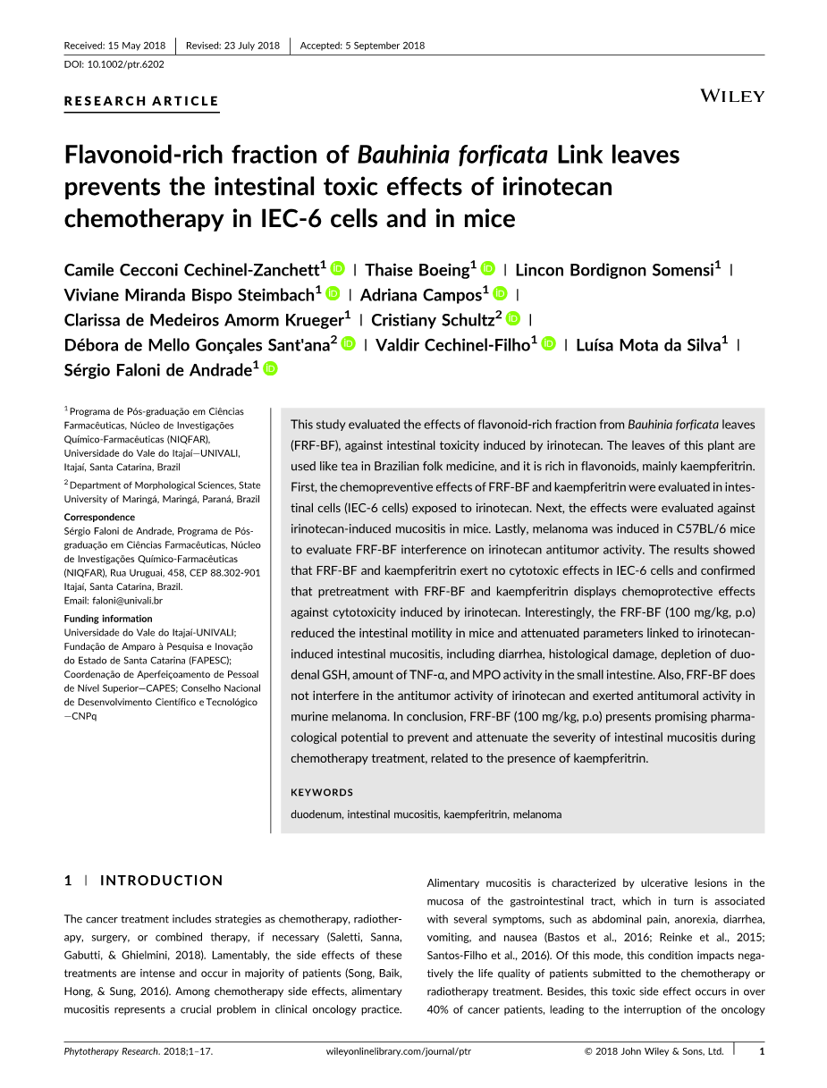 考虑到肠道毒性是可能影响癌症治疗的化学疗法的严重副作用,并且黄酮类化合物已知并被证明是有效的抗氧化剂和抗炎化合物,富含B.offataata黄酮类化合物的部分可能可预防和缓解肠粘膜炎。 。因此,本研究调查了来自B.forficata(FRF-BF)的富含黄酮类化合物的部分对伊立替康在肠上皮细胞(IEC-6细胞)和小鼠中的肠毒性的影响