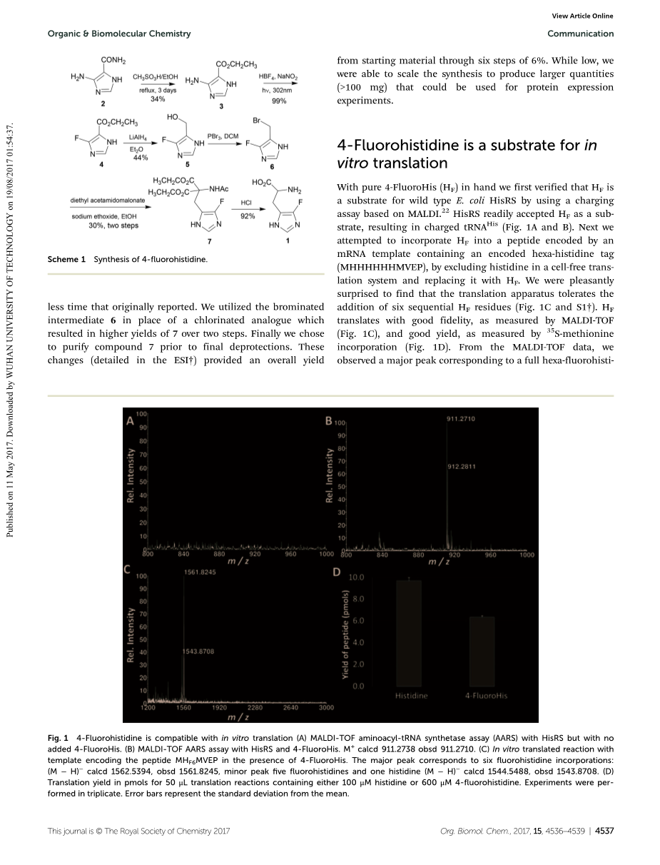 引言 因为4-氟组氨酸的酸度系数相对于组氨酸降低了,所以含有这种氨基酸的多肽和蛋白质可能具有新的性质。本文报道了4-氟组氨酸的优化合成方法,并表明其能有效替代组氨酸在体外翻译的反应。此外,含有6x-氟组氨酸标记的多肽能够在His标记的蛋白质混合物中从镍树脂中被选择性捕获和洗脱。