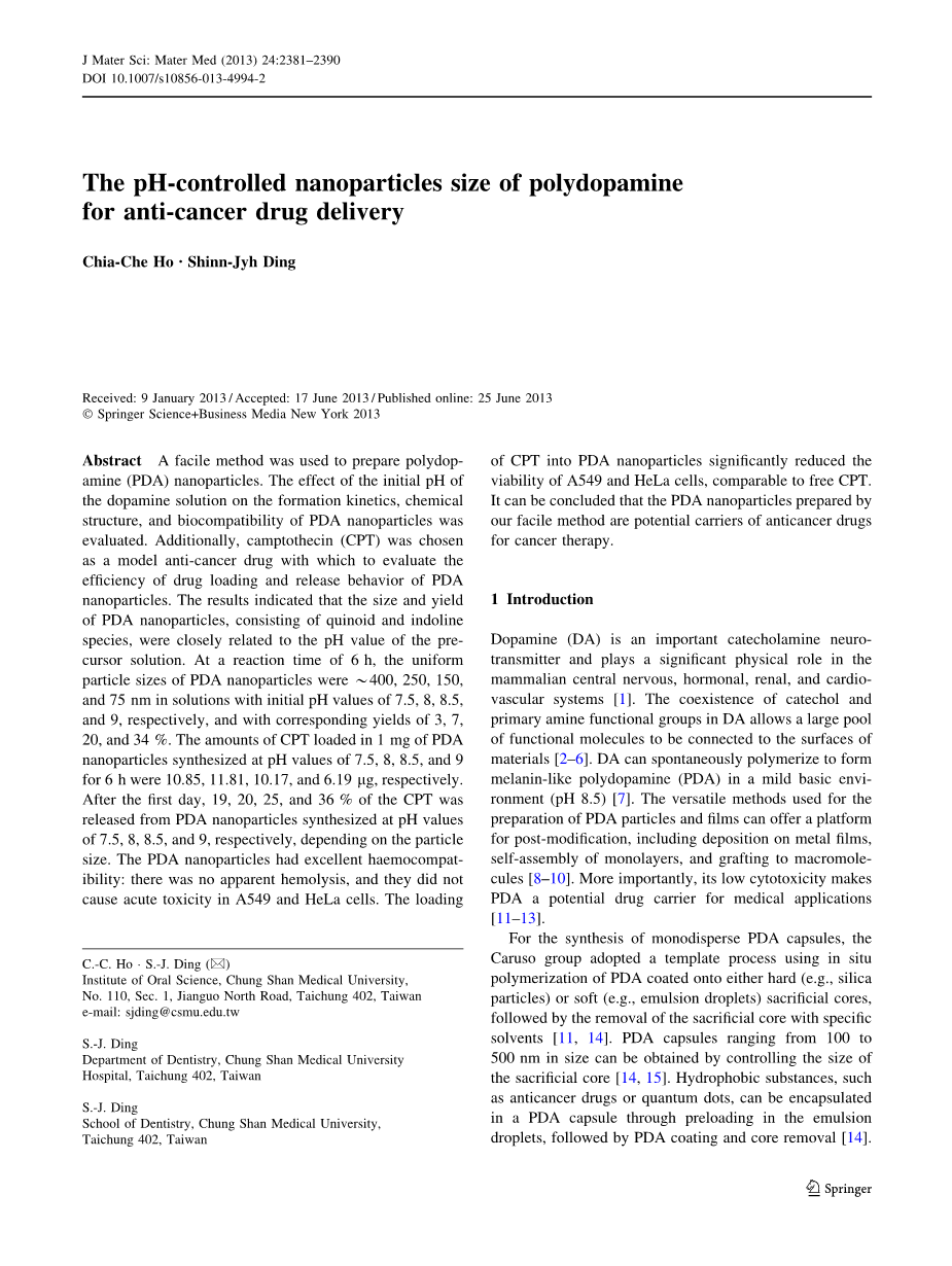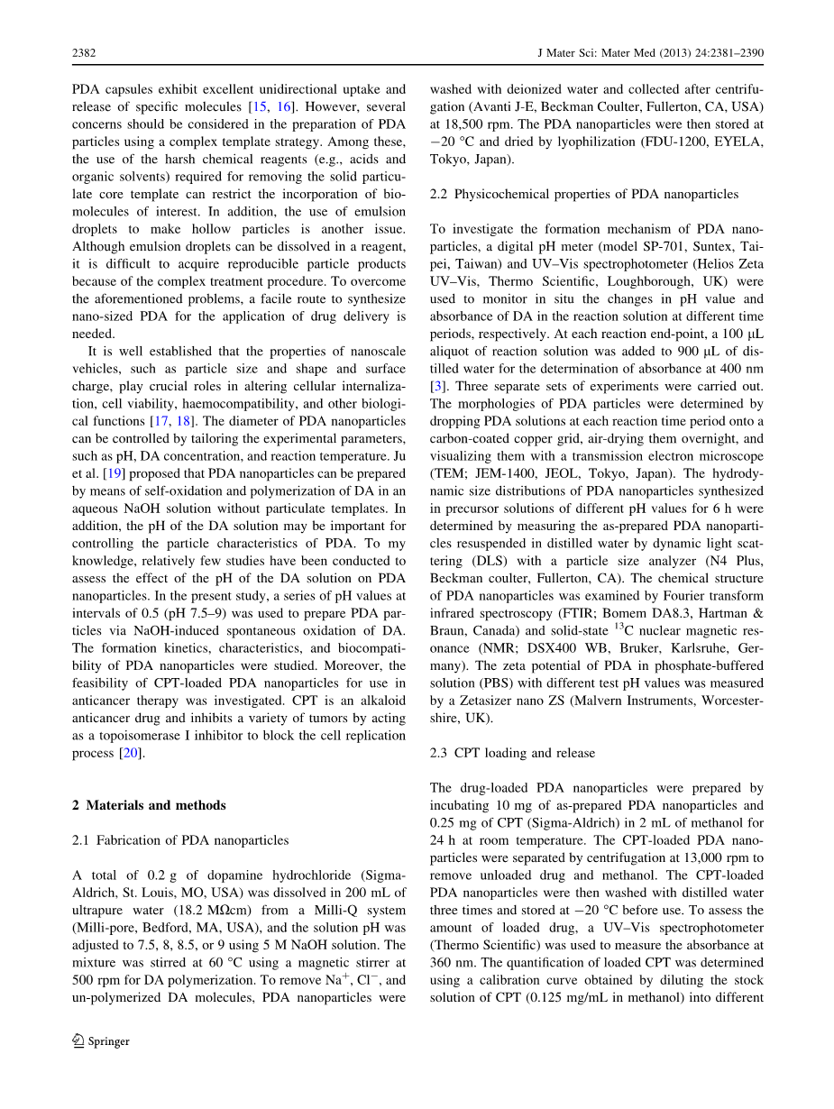 - 导言:多巴胺是一种重要的转氨酶递质,在中枢神经、肾和血管系统中起着重要的生理作用。多巴胺中临胺官能团和伯胺官能团的共存使得大量的功能分子能够连接到材料的表面。多巴胺可以自发的在温和的弱碱性(pH8.5)环境下形成类似于聚多巴胺的聚合物。用于制备聚多巴胺颗粒和薄膜的多种方法为后改性提供了平台,包括金属膜上沉积、自组装和接枝等。更重要的是,它的低纯度使得聚多巴胺成为潜在的医学药物载体。在合成聚多巴胺胶囊时,采用模板法,将聚多巴胺包裹在硬质(如二氧化硅颗粒)或者软芯(如乳化液)上进行原位组合,再用特殊溶剂除去核。可以通过控制核的大小来得到的粒径在100到500nm之间的聚多巴胺胶囊。化学物质,比如药物和量子点,可以再聚多巴胺胶囊中通过乳剂的变体,然后再涂上聚多巴胺图层和去核。聚多巴胺纳米颗粒对特定分子的吸收和释放性能优异。然而在使用复杂的模板法制备聚多巴胺纳米粒子应该考虑到以下几个问题。其中,使用苛刻的物质(不如酸和有机溶剂)除去固体后期的核心模板会限制生物分子的加入。另外利用乳化液制备空心粒子是另一个问题,虽然乳化液可以溶解在试剂中,但是由于处理过程复杂,很难获得较好的颗粒产物,为解决上述问题,需要一条合成纳米级聚多巴胺颗粒的用于药物递送的新途径。纳米颗粒的尺寸、形状和表面电荷等特性在改变细胞活性、细胞细胞活力和其它功能方面都起着至关重要的作用。pH值,多巴胺浓度、反应温度等试验参数都可以控制聚多巴胺纳米颗粒的粒径。建议在无颗粒模板的溶液中,通过多巴胺的自氧化和聚合作用制备聚多巴胺纳米粒子,此外。多巴胺溶液的pH值可能对控制聚多巴胺粒子特性有着重要意义。据我所知,对于多巴胺溶液的pH值对聚多巴胺纳米粒的影响的研究相对较少,本研究利用一系列梯度值为0.5(pH7.5-9)的pH值,通过诱发多巴胺的自氧化制备了聚多巴胺PAR,研究了聚多巴胺纳米粒子的形成动力学和性质和性能。此外还探讨了载药纳米粒用于药物治疗的可行性,CPT是一种生物碱类抗癌药物,通过作为拓扑异构酶抑制剂阻断细胞复制过程而抑制多种肿瘤。