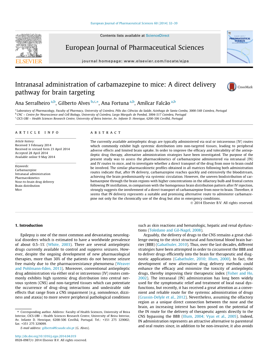 目前可用的抗癫痫药物通常通过口服或静脉内(IV)途径给药,这些途径通常表现出高度全身分布到非靶向组织中,导致外周不良反应和有限的脑摄取。为了提高抗癫痫药物疗法的功效和耐受性,已经研究了替代的给药策略。本研究的目的是评估通过鼻内(IN)和IV途径给小鼠施用的卡马西平的药代动力学,并研究是否可能涉及药物从鼻子到脑的直接转运。在两种给药途径后在所有基质中获得的类似药代动力学曲线表明,在IN递送后, 卡马西平迅速且广泛地到达血流,主要通过体循环实现脑。然而,与静脉注射后的均匀脑分布模式相比,卡马西平通过IN滴注后嗅球和额叶皮质中较高浓度的脑区域的不均匀生物分布强烈表明卡马西平从鼻子直接转运到脑。因此,似乎IN递送代表了给予卡马西平的合适且有希望的替代途径,不仅用于长期使用药物,而且还用于紧急情况。