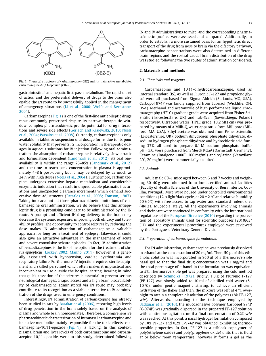 (2006年),仅根据血浆和全脑匀浆的分析报告了大脑中药物渗透的 高水平。因此,缺乏对鼻内卡马西平及其主要负责毒性作用的活性代 谢物的全面药代动力学表征,卡马西平-10,11-环氧化物(图1)。在 这方面,卡马西平和卡马西平-10,11-环氧化物的血浆,脑和肝脏水 平在本研究中确定如下