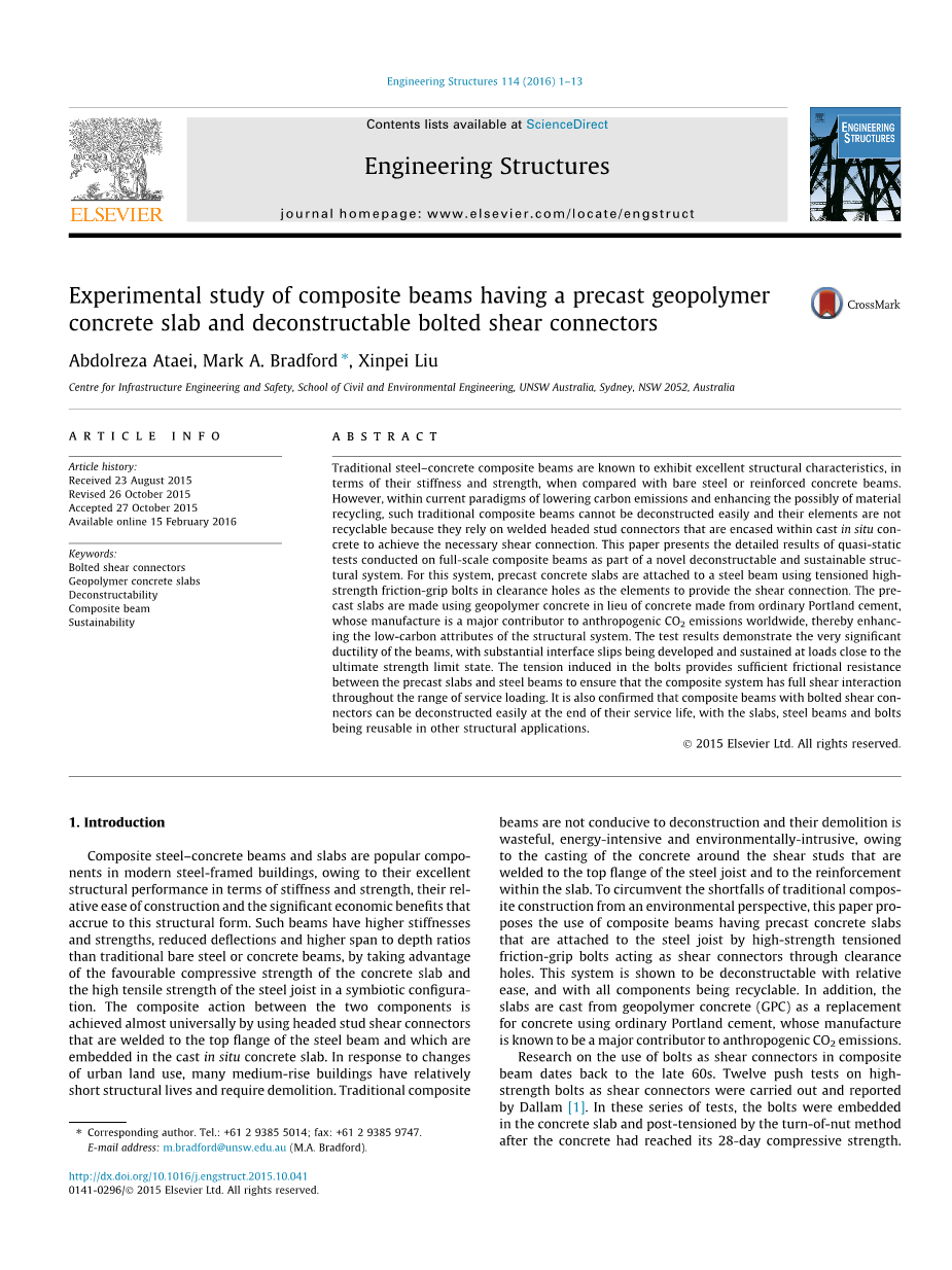 螺栓连接剪切连接件地质聚合物混凝土板可解构性复合梁可持续性