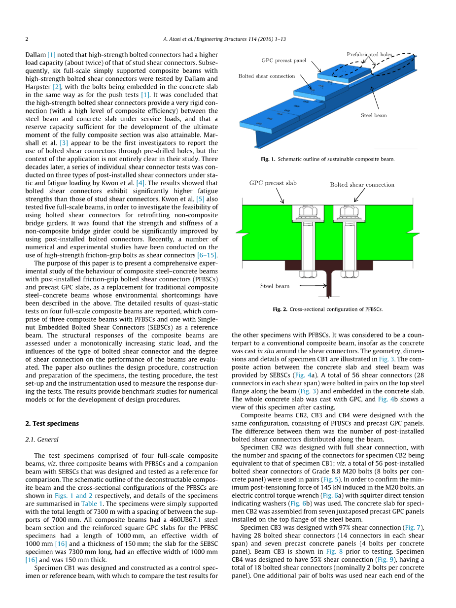由于将混凝土浇筑在与钢制托梁的顶部凸缘焊接的抗剪栓钉周围以及板坯内部的钢筋周围,所以梁不利于解构并且其拆除是浪费的,能量密集的和环境侵入性的。 为了从环境角度避免传统复合材料结构的缺陷,本文提出使用具有预制混凝土板的组合梁,该预制混凝土板通过作为剪切连接件的高强度张紧摩擦夹紧螺栓通过间隙孔连接到钢梁上。 这个系统被证明是相对容易解构的,并且所有组件都是可回收的。 此外,使用普通波特兰水泥替代混凝土,其地板聚合物混凝土(GPC)被浇铸,其普通波特兰水泥的制造被认为是人为CO\排放的主要贡献者。 在组合梁中使用螺栓作为剪力连接件的研究可以追溯到60年代后期。 达拉姆对高强度螺栓进行了12次推力测试,并进行了剪切连接器的测试[1]。 在这些系列测试中,在混凝土达到28天抗压强度后,将螺栓嵌入混凝土板中,并通过螺帽法进行后张。