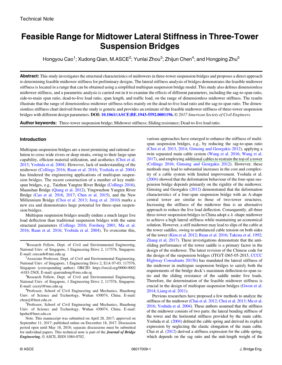 由于其跨度大,材料利用率高和美观等特点,多跨式悬索桥是跨越广阔河流或深海海峡的最有希望和合理的解决方案(Choi等人2013; 吉田等人 2004年)。但是,对中主塔缺乏了解(Collings 2016; 阮等人;2016; 吉田等人 2004年)阻碍了多跨悬索桥的工程应用。近期兴建了多座重点多跨桥梁,如台州长江大桥(Collings 2016),马鞍山大桥(Qiang等人2012),鹦鹉洲长江大桥(曹等人2016, 2017; 陈等人2015年)和新千年桥(Choi等人2013; Jung等人2010)标志着一个新时代,并展现出三跨悬索桥的巨大潜力。