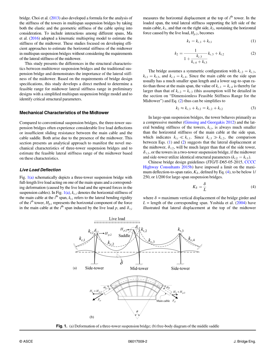 以前的研究人员提出了几种分析方法来分析中主塔的刚度(柴等2012; Choi等人2013; 马等人2016; 吉田等人2004年)。这些作者假定中间桥的刚度由两部分组成:塔的横向弯曲刚度和主缆提供的水平刚度。 吉田等人(2004)定义了主缆弹簧,并忽略了主缆的弹性伸长,从而得出了其明确的表达。柴等人(2012)导出了主缆弹簧的刚度表达式,其取决于桥的垂度比和单位长度重量。Choi等人(2013)还考虑了主缆弹簧弹性刚度和弹簧的几何刚度,开发了一种用于分析多跨悬索桥中的塔架刚度的公式。为了包括不同跨度之间的相互作用,Ma等人 (2016)采用运动学多弹簧模型来估计中塔的刚度。这些研究集中在没有考虑多跨式悬索桥中主塔侧向刚度的要求下发展高效率估算中主塔的水平刚度的有效方法。