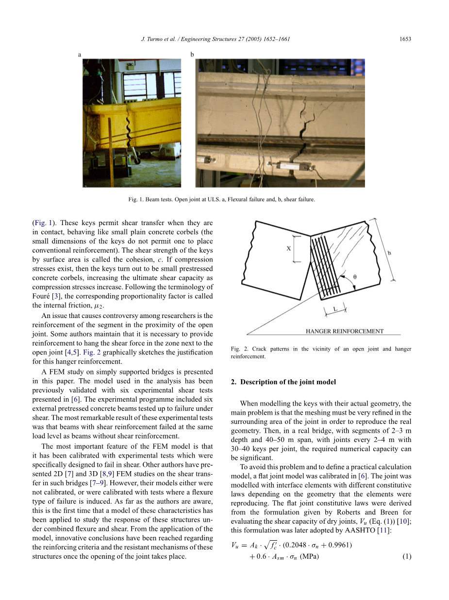 (图。1)。 这些钥匙在接触时允许剪切转移,表现得像小的普通混凝土牛腿(钥匙的小尺寸不允许放置传统钢筋)。 按表面积划分的键的抗剪强度称为内聚力c。 如果存在压缩应力,那么这些键就会变成小的预应力混凝土牛腿,随着压缩应力的增加而增加极限剪切能力。 按照Foureacute;的术语[3],相应的比例系数称为内部摩擦,mu;\。