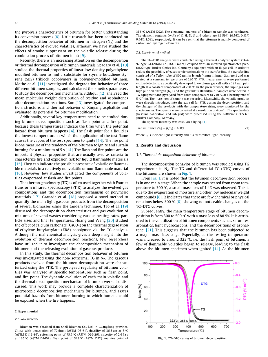 本文采用非等温热重法研究了沥青在N2中的热分解行为。利用傅里叶红外光谱对沥青分解过程中产生的气态产物进行了表征。沥青的热解规律在像闪点、燃点这样的特殊温度下进行分析。对沥青的挥发性动态演化和热分解机理也进行了讨论。这项工作可能会对沥青的微观分解机制提供一个完整的表征,同时评估当火灾发生时暴露接触人员面临的潜在危险。