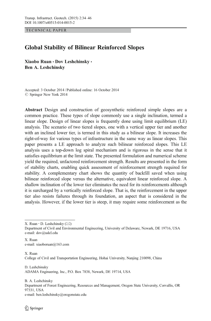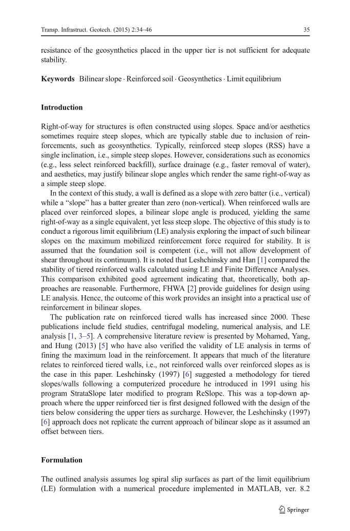 自2000年以来,关于分层加筋墙的文献出版率有所提高。这些出版物包括实地研究,离心模拟,数值分析和LE分析[1,3-5]。 Mohamed,Yang和Hung(2013)[5]提供了一份全面的文献综述,他们也验证了LE分析在确定钢筋最大载荷方面的有效性。看来,许多文献都涉及到加固的分层墙,而不是在加固斜坡上的加筋墙,也就是本文中的情况,。 Leshchinsky(1997)[6]在他1991年提出了一种用于分层斜坡/墙的方法,并提出了相关的计算机化程序,其中StrataSlope程序后来修改为ReSlope程序。这是一种自顶向下的方法,其中首先设计上部加强层,接着考虑上部层次作为附加结构,然后进行下部设计。然而,Leshchinsky(1997)[6]的方法并没有重现当前研究双线性斜坡的方法,因为它假定层之间有偏移。