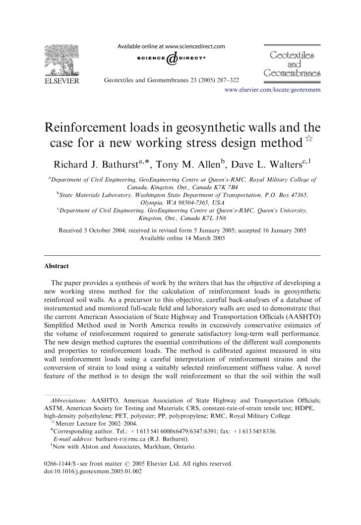 本文提供了作者的综合研究成果,其目的在于开发一种新的工作应力方法来计算土工合成加筋土墙的加筋荷载。作为这一目标的先导,对安装了监控设备和观测元件的现场足尺加筋挡土墙和室内模型墙的观测数据进行的仔细分析,证明了目前美国国家公路和运输协会(AASHTO)在北美所使用的简化方法有些问题,通过这种方法所得到的能满足墙体的长期良好性能所需的加筋量是过于保守的。新的设计方法着重强调了不同的墙体构件和特性对加筋荷载的重要影响。该方法使用对加筋应变的仔细解读和挑选合适的加筋刚度值将应变转化为荷载的方式来对测量的现场墙体加筋荷载进行校准。该方法的一个新特征是设计墙体加强,以防止墙内回填土内的土壤达到破坏极限状态,也让其符合工作压力条件的原则。