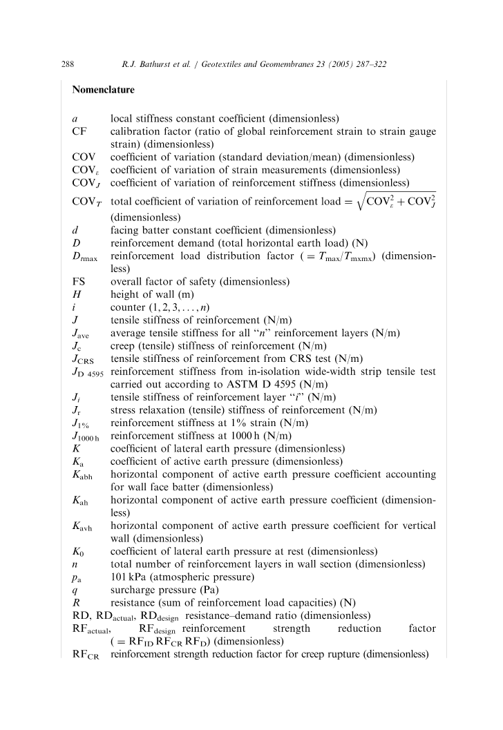 图1中的数据显示,对于数据库中具有良好长期性能的大多数墙壁,RD大于1,表明AASHTO的原始设计与使用较大(平面应变)峰值摩擦角和较低(实际)强度折减系数的AASHTO设计相比过于保守。但是,如图1所示,即使RD比率小于1,墙壁也表现出良好的性能。事实上,仔细分析表明,即使在计算中使用了对摩擦角和强度折减系数的最佳估计值,这些墙实际上也只包含了当前AASHTO方法所需的加筋的一半。在某些情况下,只有所需加筋的八分之一。由研究者对数据中的所有墙体的进一步调查显示,还有其他的设计保守源,包括对三轴或直接剪切试验结果的低估计,以及在墙顶下的深度作用下加筋强度与需求的不完全匹配。如果这些来源被解释,剩下的保守主义看起来就相当于一个额外的安全系数1.5-4,而且很可能是由于在当前的AASHTO(Allen et al., 2002)简化方法中使用的荷载预测模型的保守性(不准确)。在目前的加筋设计实践中减少过度保守主义的潜力是显而易见的。