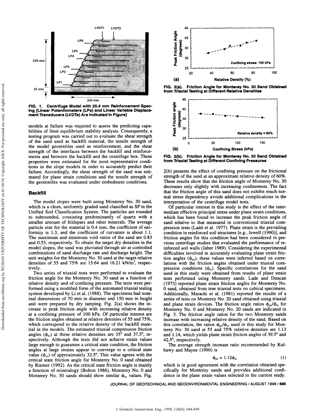 在本研究中特别是在平面应变条件下的中间有效主应力的影响,它已被Ladd等人在1990年发现以增加相对于常规三轴压缩试验中测量的峰值摩擦角。平面应变是在加筋土结构中普遍的,对于这种状态的摩擦角在以前的离心机研究中被认为是对加筋土挡墙的性能反映。在准确评价平面应变摩擦角的实验难题中,这些值是基于三轴压缩条件下得到的摩擦角。对本研究中所用砂的特殊关系是从平面应变试验结果获得。Lade和Duncan在1973年报道Monterey No. 0的平面应变摩擦角,从立方体试样真三轴试验得到的。此外,Marachi等人在1981年报道了利用三轴和平面应变装置对 Monterey No. 20号砂进行的一系列试验的结果。Monterey No. 0和Monterey No. 20砂的摩擦角比在图3显示。两种Monterey砂的摩擦角比随着相对密度的增大而增大。基于这种相关性,该值在Monterey No. 30砂中为55和75%,相对密度分别为1.13和1.14,其中平面应变摩擦角分别为39.50和42.5°。