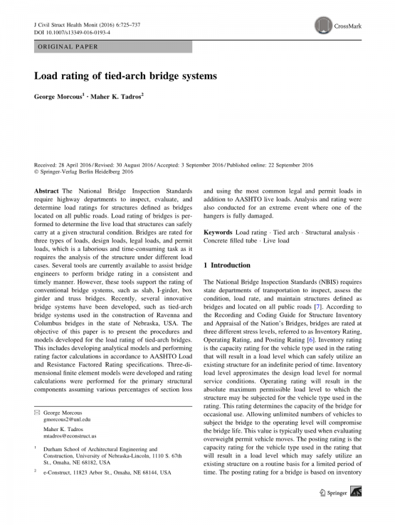 “国家桥梁检查标准”要求公路部门对所有公共道路上定义为桥梁的结构进行检查、评估和确定荷载等级。桥梁的荷载额定值是为了确定结构在给定的结构条件下能够安全承受的活荷载。桥梁分为设计荷载、法定荷载和容许荷载三类,这是一项非常耗时的任务,因为它需要对不同荷载情况下的结构进行分析。目前有几种工具可用于协助桥梁工程师以持续和及时的方式进行桥梁评定。然而,这些工具支持对传统桥梁系统的评定,如板,I-梁,箱梁和桁架桥。最近,开发了几种创新的桥梁系统,例如在美国内布拉斯加州建造拉文纳和哥伦布桥梁时使用的系杆拱桥系统。本文的目的是介绍为系杆拱桥的额定载荷开发的程序和模型。这包括开发分析模型并根据AASHTO荷载和电阻因子评级规范执行评级因子计算。开发了三维有限元模型,并对主要结构部件进行了评级计算,假设各种百分比的截面损失,并使用除AASHTO活荷载之外最常见的法定和容许载荷。对其中一个吊杆完全损坏的极端事件也进行了分析和评级。