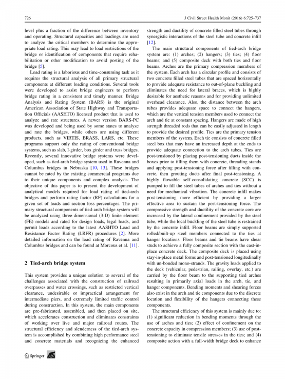 额定荷载是一项费力且耗时的任务,因为它需要在不同负载条件下对所有主要结构部件进行结构分析。开发了几种工具来帮助桥梁工程师以持续和及时的方式执行桥梁评级。桥梁分析和评级系统(BARS)是最初的美国国家公路和运输官员协会(AASHTO)许可产品,用于分析和评估结构。更新版本的BARS-PC被开发并被一些州用于分析和评估桥梁,而其他州则使用不同的产品,例如VIRTIS,BRASS,LARS等。这些程序仅支持传统桥梁系统的等级,例如作为平板,I梁,箱梁和桁架桥。最近,开发了几种创新的桥梁系统,[10,13]。由于其独特的组件和复杂的分析,这些桥梁无法通过现有的商业计划进行评级。本文的目的是介绍系杆拱桥额定载荷所需的分析模型的开发,并对给定的一组载荷和截面损失百分比进行额定系数(RF)计算。系杆拱桥系统的主要结构部件将使用三维(3-D)有限元(FE)模型进行分析,并根据最新的AASHTO载荷和阻力系数等级对设计载荷,法定载荷和容许载荷进行评级。(LRFR)程序[2]。关于拉文纳和哥伦布桥的额定载荷的更详细信息可以在Morcous等人的文章里找到。[11]