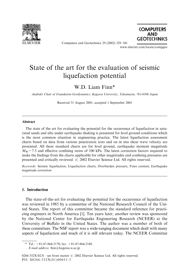 摘要:地震作用下饱和砂土和淤泥液化发生的可能性评价技术是为工程实践中最普遍的水平地面条件提出的。介绍了基于各种贯入试验数据和原位剪切波速的最新液化评估图。所有这些标准图是基于水平地面,地震矩震级Mw=7.5,有效围压为100 kPa的情况的。提出了最新的修正因子需要在适用于其他震级和围压的图表上进行分析,并进行严格审查。copy; 2002Elsevier科技有限公司。保留所有版权。