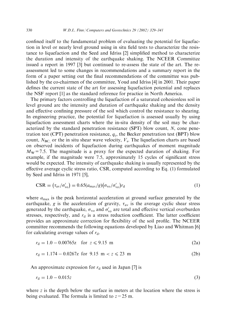 其中,amax为地震产生的地表峰值水平加速度,g为重力加速度,tau;av为地震产生的的平均周期性剪切应力,sigma;vo和sigma;rsquo;vo分别为总体和有效垂直覆盖层应力,rd是应力降低系数。后面的系数为土壤剖面的灵活性提供了近似的修正。NCEER委员会建议由Liao和Whitman开发的以下公式计算rd的平均值。