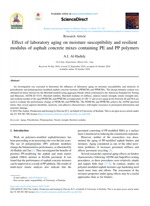 本研究致力于确定老化过程(100℃进行48小时,100℃ 进行96小时)聚乙烯的水分敏感性和弹性或聚丙烯改性混凝土混合物和聚丙烯改性沥青混凝土混合料)在100℃和两次老化时水平在48小时到96小时之间,并将所得结果与对照混合物的结果进行比较。