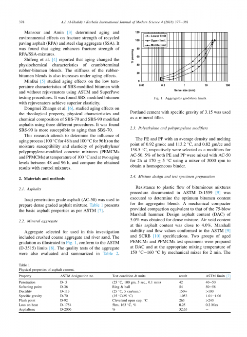 伊拉克渗透级沥青(AC-50)被用于配制密级配沥青混合料。表1呈现基本沥青性能符合美国材料与试验协会[7]。