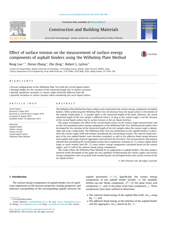 本文研究了弯曲液面对Wilhelmy插板试验中接触角测量和相应表面能分量的影响,并分别建立了接触角为钝角、直角和锐角时试样浸没长度变化的数学模型。采用Wilhelmy插板试验对两种沥青粘结料进行了接触角的测定,并在是否考虑弯曲液面这两种情况下进行了接触角的测量。因此,我们评估了两种沥青粘结料的粘结能,以及从文献中选取的一种砾石集料与每种沥青之间的粘结能。测量和分析表明,考虑液体曲面的弯曲将导致的明显不同之处体现在: