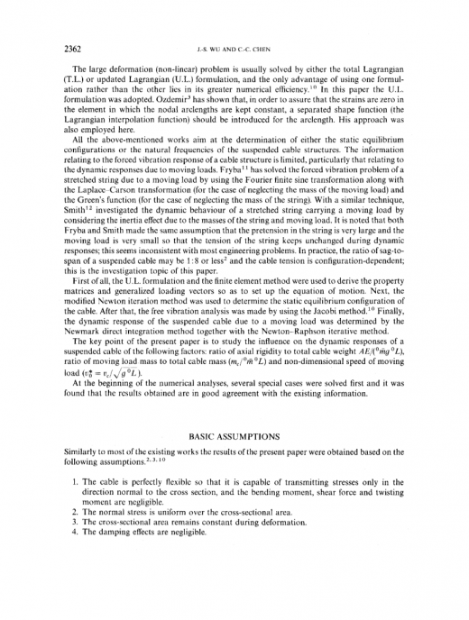 大多数早期的研究人员,如欧文,2普格斯利 * 和欧文和辛克莱,试图通过分析来解决电缆问题。 近年来,随着数字计算机的出现,人们提出了许多数值方法。 在《参考文献3》的介绍中,Ozdemir 对 Leonard、Henghold 和 Russell7、Gambhir 和 Batchelor 提出的一些有代表性的方法作了简要的回顾。 西部 CT AL9 所提出的方法也是值得提及的;他们将悬索视为由有限个无摩擦销连接的直杆组成的连杆机构,并用传递矩阵法确定悬索的固有频率和振型。