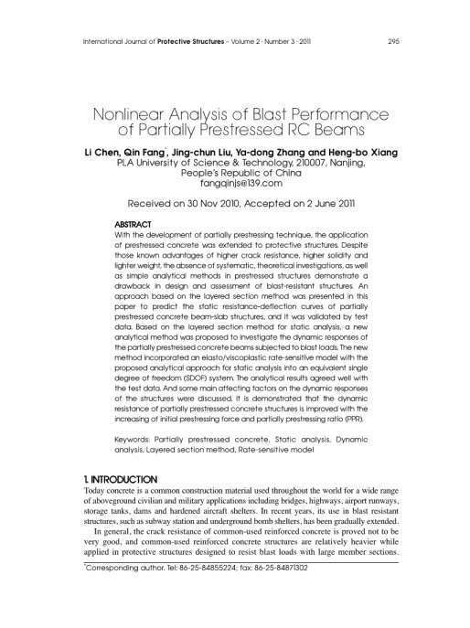 随着部分预应力技术的发展,预应力混凝土的应用扩展到了防护结构。尽管预应力混凝土拥有更强的抗裂性、更好的稳固性以及更轻的质量这些众所周知的优点,但是在预应力结构方面系统性、理论性调查以及简单分析方法的缺失证明了其在抗爆性能结构的设计和评估方面的缺陷。在这篇论文中呈现了基于分层分析方法的手段,以此来预测部分预应力梁板结构的静态挠度阻力曲线。并且这已经被测试数据证实了。为了调查部分预应力混凝土梁屈服于爆破压力的动态反应,提出了基于分层分段法的静态分析是一种新的分析方法。这种新的分析方法不仅是对等效单自由度系统静态分析提出的分析方法,还包括对弹塑性速率敏感模型。分析结果与测试数据十分吻合。而且一些主要的在结构的动态反应方面的影响因素讨论结束的结论是,部分预应力混凝土结构的动态阻力随着初始预应力和部分预应力率的增长提高了。
