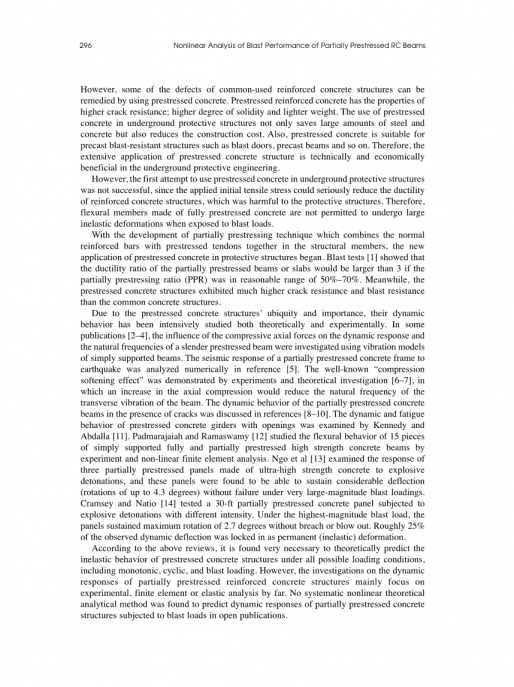 根据以上,我们发现根据理论预测预应力混凝土建筑在所有可能的荷载情况下的非弹性性能是非常必要的,包括单调变化的、周期性变化的和爆炸荷载。但是,部分预应力钢筋混凝土建筑的关于动态反应的调查到目前为止主要关注点在试验和有限元或者弹性分析上。在公开出版物中,没有系统性的非线性理论分析方法被发现用来预测部分预应力混凝土建筑屈服于爆炸荷载的动态反应。