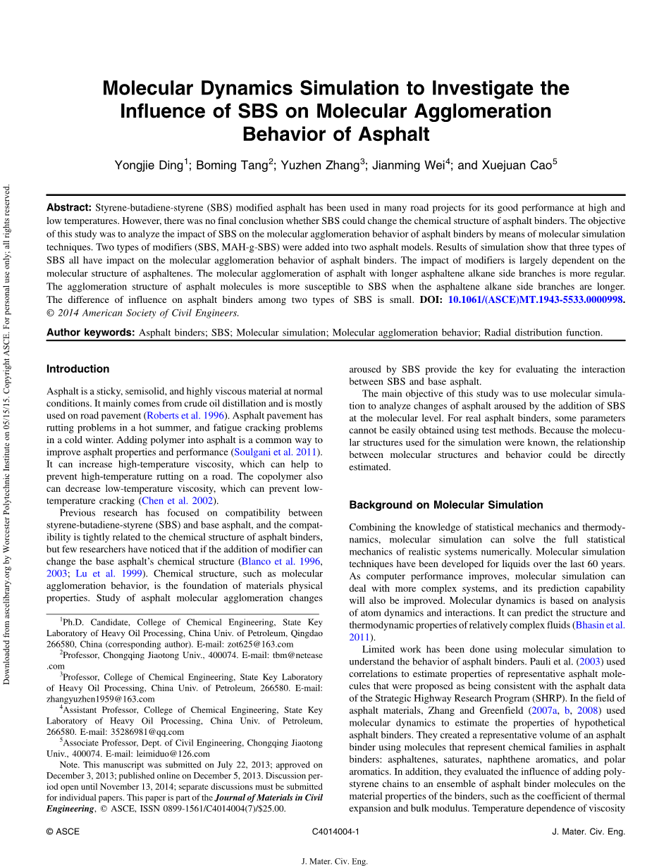 摘要:SBS改性沥青已经因其在高温和低温下的良好表现而被应用于众多道路项目中。但是对于SBS能否改变沥青结合料的化学结构尚无最终定论。本文的目的是通过分子模拟技术来分析SBS对沥青结合料分子团聚状态的影响。两种改性剂(SBS和MAH-g-SBS)被加入两个沥青模型中。模拟结果显示三种不同的SBS都对沥青结合料分子团聚状态存在影响。改性剂的影响主要依赖于沥青质的分子结构。带有更长沥青质链烷面分支的沥青分子团聚更有规则。当沥青质链烷面分支更长时,沥青分子的团聚结构更容易受影响。两种SBS改性剂对沥青结合料影响的差别是微小的。