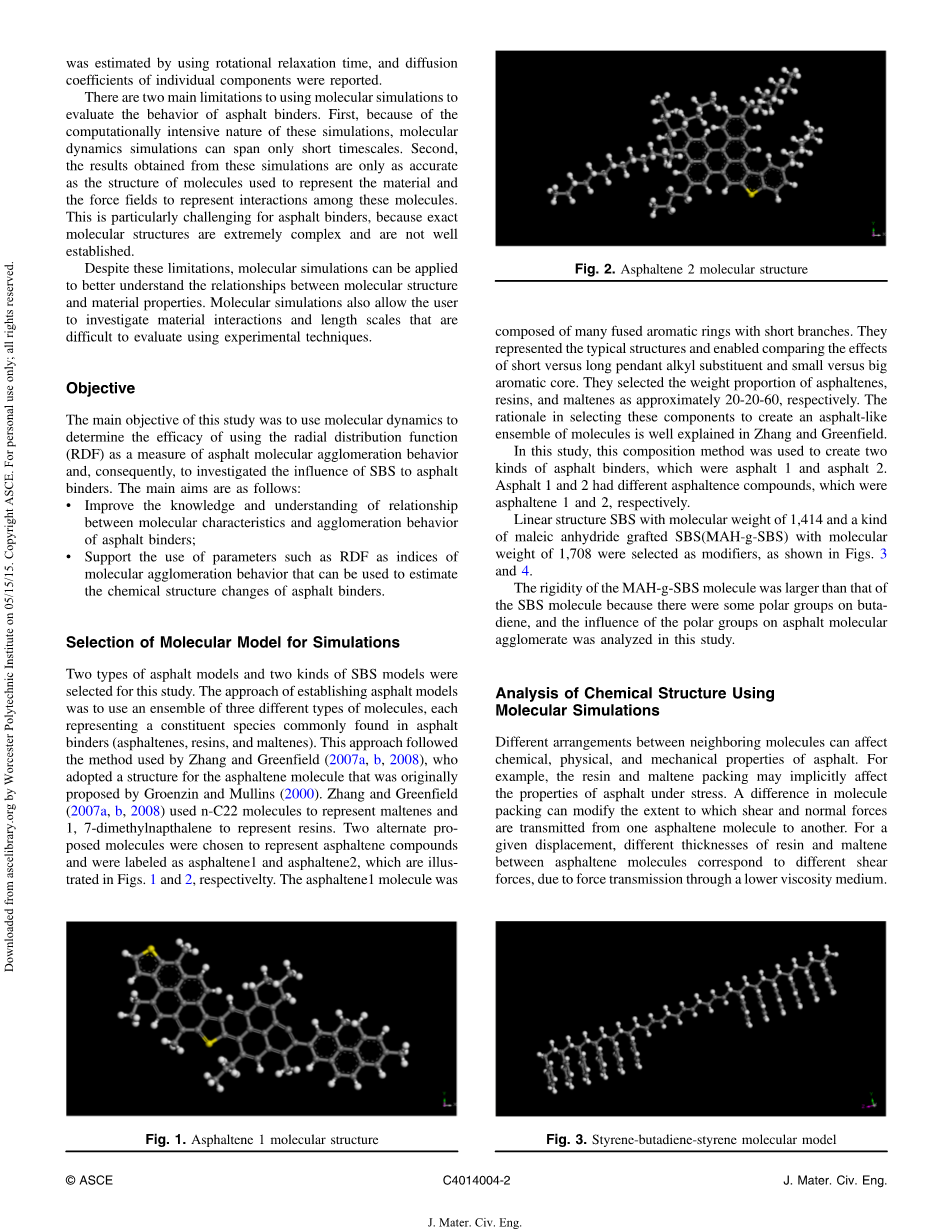 相关研究已经采用分子模拟技术来了解沥青结合料的状态。Pauli et al. (2003)运用对比法来评估典型的沥青分子。这些分子与在Strategic Highway Research Program (SHRP)项目中提出的沥青数据是一致的。在沥青材料领域,Zhang和Greenfield (2007a,b,2008)运用分子动力学来评估假设的沥青结合料的属性。他们用代表沥青结合料化学成分的沥青质、饱和烃、脂环烃、芳香族、极性芳烃等分子建立了一个典型的沥青结合料体。此外,对于结合料的材料属性,比如热膨胀系数和体积弹性系数,他们评估了在沥青结合料分子组中加入聚苯乙烯链后的影响。运用转动张弛时间,他们估算了黏滞度的温度相关性,同时,报告了单个组件的扩散系数。