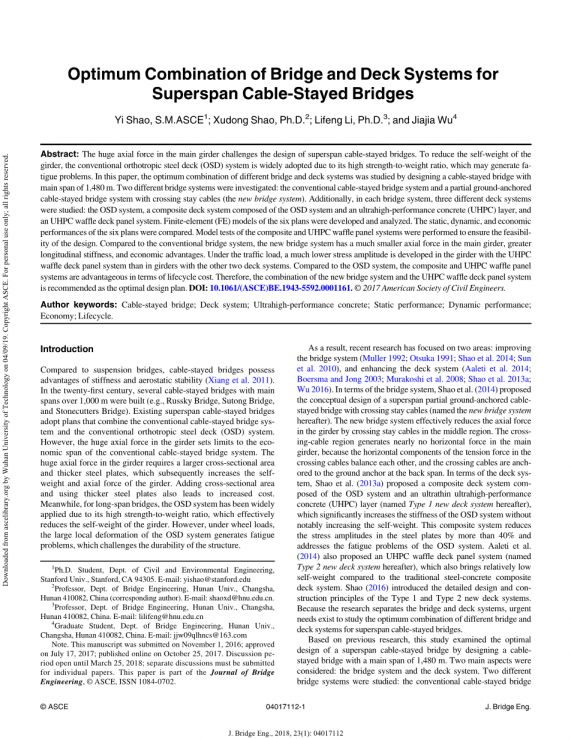 关键词:斜拉桥;面板系统;超高性能混凝土;静态性能;动态性能;经济;使用年限