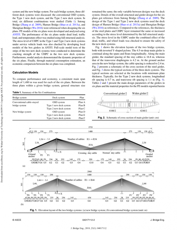 摘 要:主梁的巨大轴力对超跨斜拉桥的设计提出了挑战。为了减少梁的自重,传统的正交异性钢板(OSD)系统由于其高强度重量比而被广泛采用,这可能产生疲劳问题。本文通过设计一个主跨为1,480 m的斜拉桥,研究了不同桥梁和桥面系统的最佳组合。研究了两种不同的桥梁系统:传统的斜拉桥系统和带有交叉斜拉索的部分地锚式斜拉桥系统(新的桥梁系统)。此外,在每个桥梁系统中,研究了三种不同的面板系统:OSD系统,由OSD系统和超高性能混凝土(UHPC)层组成的复合面板系统,以及UHPC华夫板面板系统。开发并分析了六个方案的有限元(FE)模型。比较了六个方案的静态、动态和经济性能。进行复合和UHPC华夫板系统的模型试验以确保设计的可行性。与传统的桥梁系统相比,新的桥梁系统在主梁上具有小得多的轴向力,更大的纵向刚度和经济优势。在车道荷载下,使用UHPC华夫板面板系统的主梁产生的应力幅度远低于其他两个面板系统的主梁。与OSD系统相比,复合和UHPC格栅板系统在使用年限成本方面是有利的。因此,建议将新桥系统和UHPC华夫板面板系统相结合作为最佳设计方案。