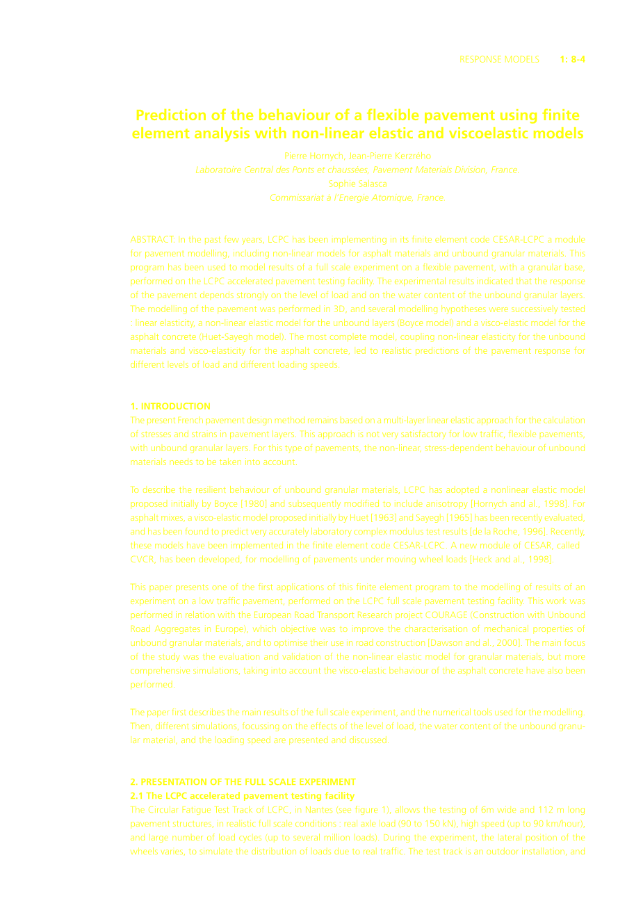 在过去的几年中,LCPC已在其现有的有限元代码CESAR-LCPC的基础上创建了用于路面建模的模块,其中包括沥青材料和未结合粒料材料的非线性模型。该程序对在LCPC加速路面测试设备上进行的,具有粒料层的柔性路面上的全尺寸实验的结果进行建模。实验结果表明,路面响应在很大程度上取决于荷载水平和未结合粒料层的含水量。路面的建模是在3D模式下进行的,并依次测试了几种建模假设:线性弹性模型、具有未结合粒料层的非线性弹性模型(Boyce模型)和沥青混凝土的粘弹性模型(Huet-Sayegh模型)。其中最完整的模型将未粘结材料的非线性弹性与沥青混凝土的粘弹性耦合在一起,从而得出了在不同载荷水平和不同载荷速度下路面响应的真实预测情况。