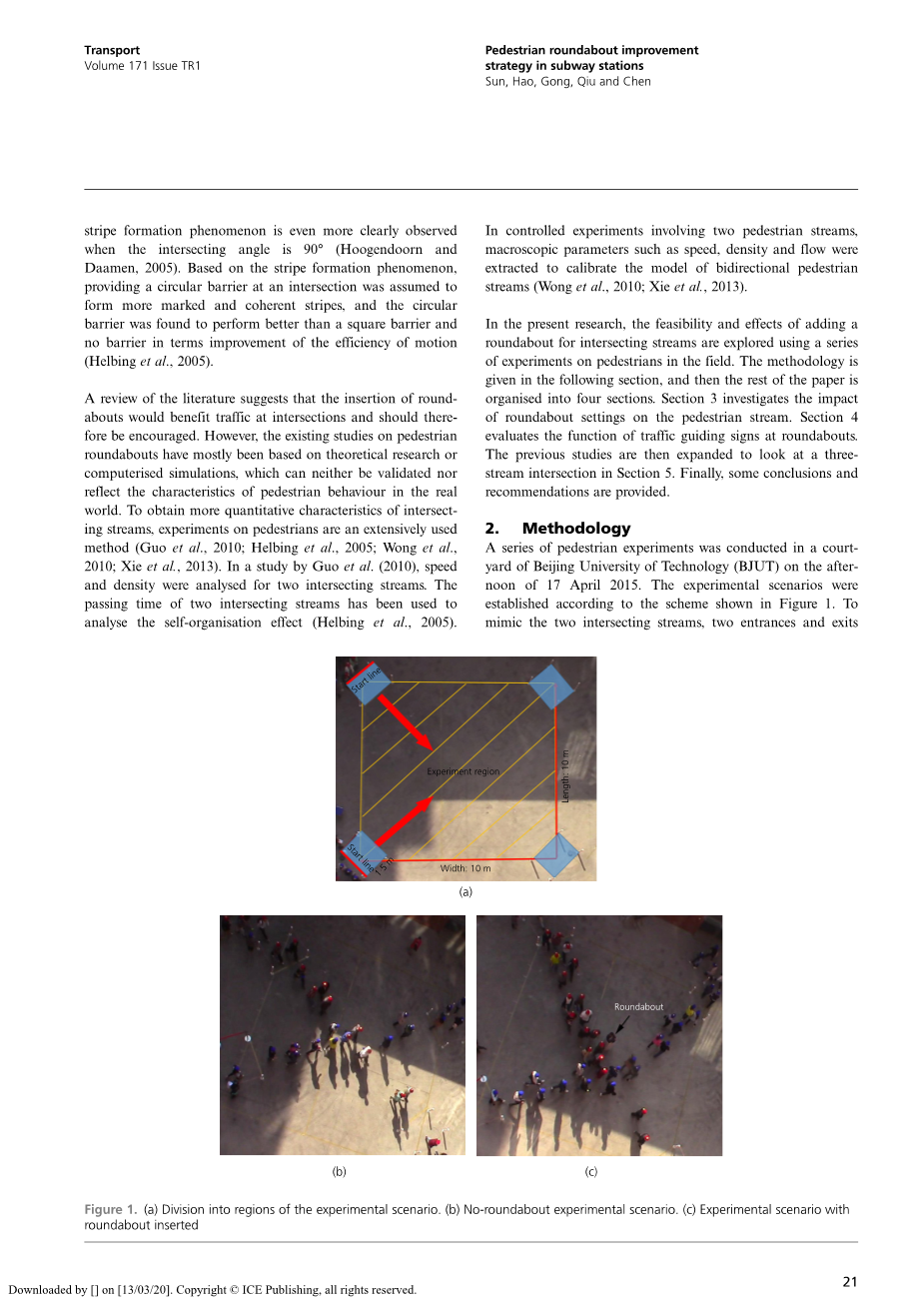 对文献的回顾表明,在交叉口插入环形交叉口将有利于交通,因此应予以鼓励。然而,现有的研究大多是基于理论研究或计算机模拟,既不能验证也不能反映现实世界中行人行为的特点。为了获得交叉人流的更多定量特征,行人实验是一种广泛使用的方法(Guo等人,2010;Helbing等人,2005;W ong等人,2010;Xie等人,2013)。在郭等人的研究中。(2010)分析了两条相交人流的速度和密度。利用两个相交流的通过时间来分析自组织效应(Helbing等人,2005)。在涉及两条人流的控制实验中,提取速度、密度和流量等宏观参数来校准双向人流模型(W ong 等人,2010;Xie 等人.,2013)。