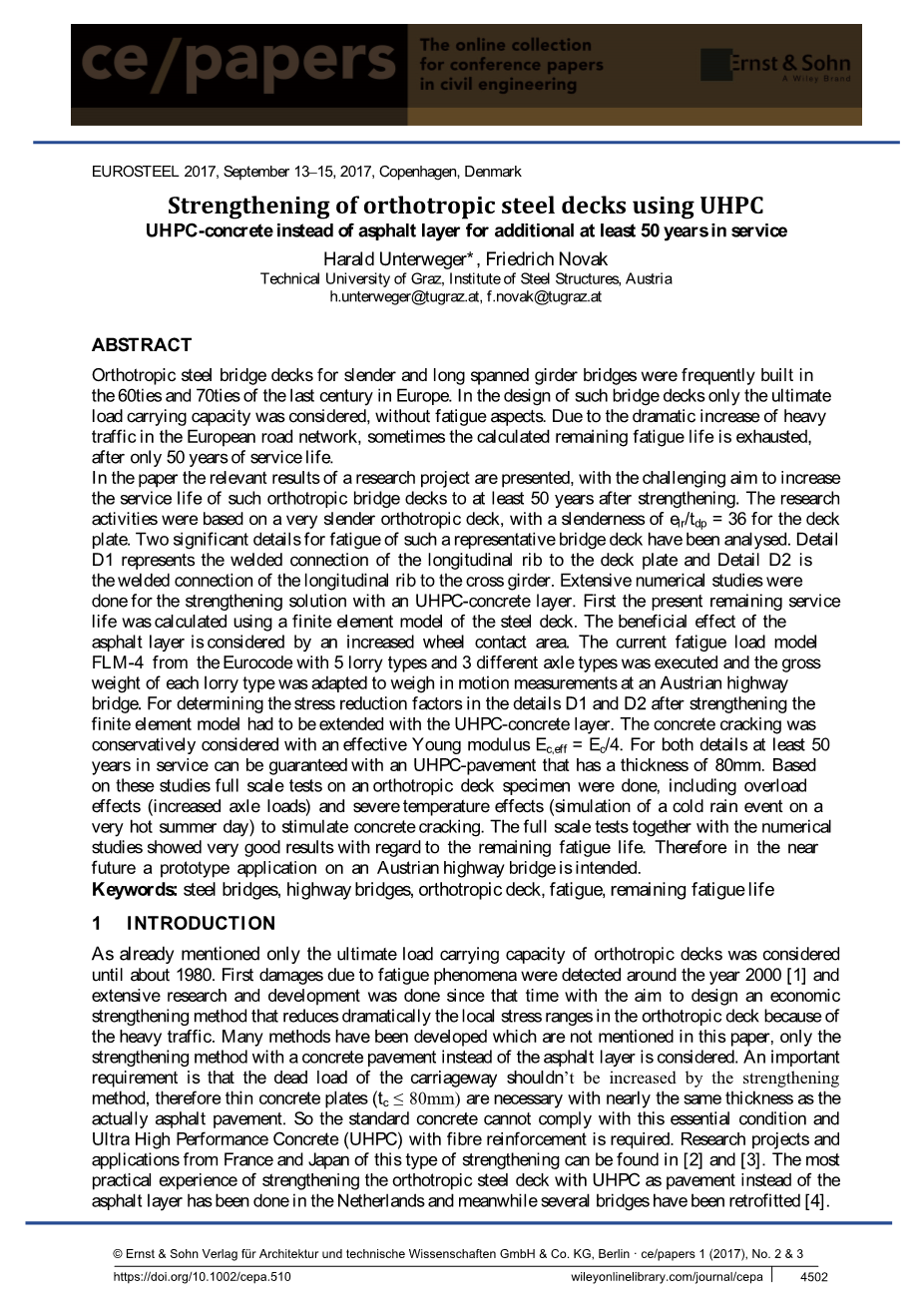 本文介绍了一个研究项目的相关成果,旨在将此类正交异性桥面加固后的使用寿命提高到至少50年。研究活动基于一个非常细长的正交各向异性桥面,桥面的长细比为elr/tdp=36。分析了这类典型桥面疲劳的两个重要细节。详图D1表示纵肋与桥面板的焊接连接,详图D2表示纵肋与横梁的焊接连接。对UHPC混凝土层加固方案进行了广泛的数值研究。首先,利用钢桥面有限元模型计算了目前的剩余使用寿命。沥青层的有益作用可通过增加车轮接触面积来体现。现行欧洲规范中的FLM-4疲劳载荷模型,对5种货车类型和3种不同车轴类型进行了规定,并且每种货车类型的总重量适合奥地利公路桥梁的动态称重测量。为了确定加固后详图D1和D2中的应力折减系数,必须将有限元模型扩展为UHPC混凝土层。保守地考虑了混凝土开裂的有效杨氏模量Ec,eff=Ec/4。对于这两个细节,使用厚度为80mm的UHPC路面可保证至少50年的使用寿命。在这些研究的基础上,对正交异性桥面试件进行了全尺寸试验,包括超载效应(轴载增加)和苛刻的温度效应(在非常炎热的夏季模拟一场冷雨事件),以刺激混凝土开裂。因此,在不久的将来,一个在奥地利公路桥梁方面的原型应用将应运而生。