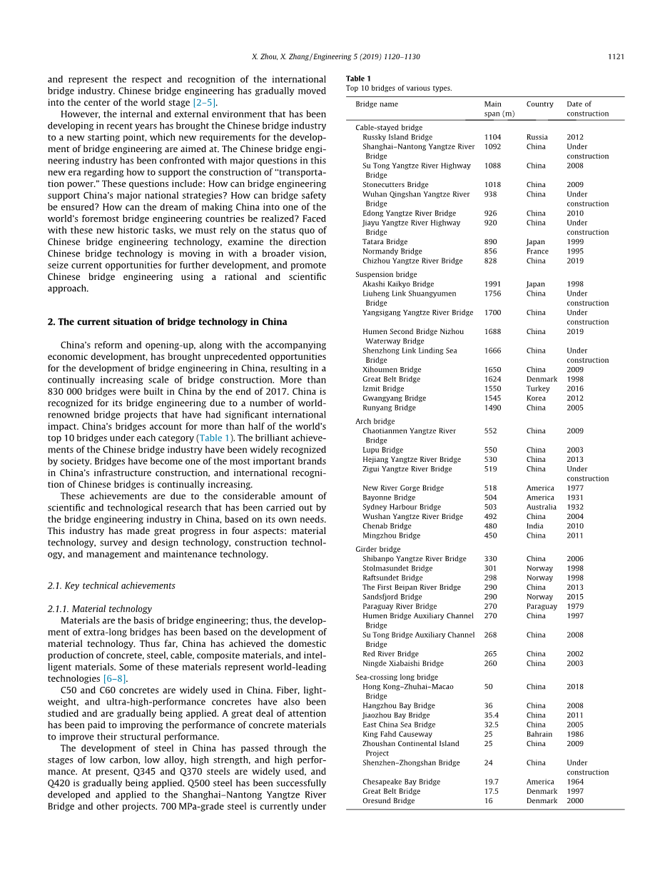 伴随着经济的发展,中国的改革开放为中国桥梁工程的发展带来了前所未有的机遇,桥梁建设规模不断扩大。截至2017年底,中国已建造了83万多座桥梁。由于许多享誉国际的国际知名桥梁项目,中国桥梁工程行业以其拥有大量拥有重大国际影响的世界知名桥梁而闻名。在每个类别下,中国的桥梁占世界十大桥梁的一半以上(表1)。中国桥梁行业的辉煌成就已被社会广泛认可。桥梁已成为中国基础设施建设中最重要的品牌之一,并且中国桥梁的国际认可度也在不断提高。