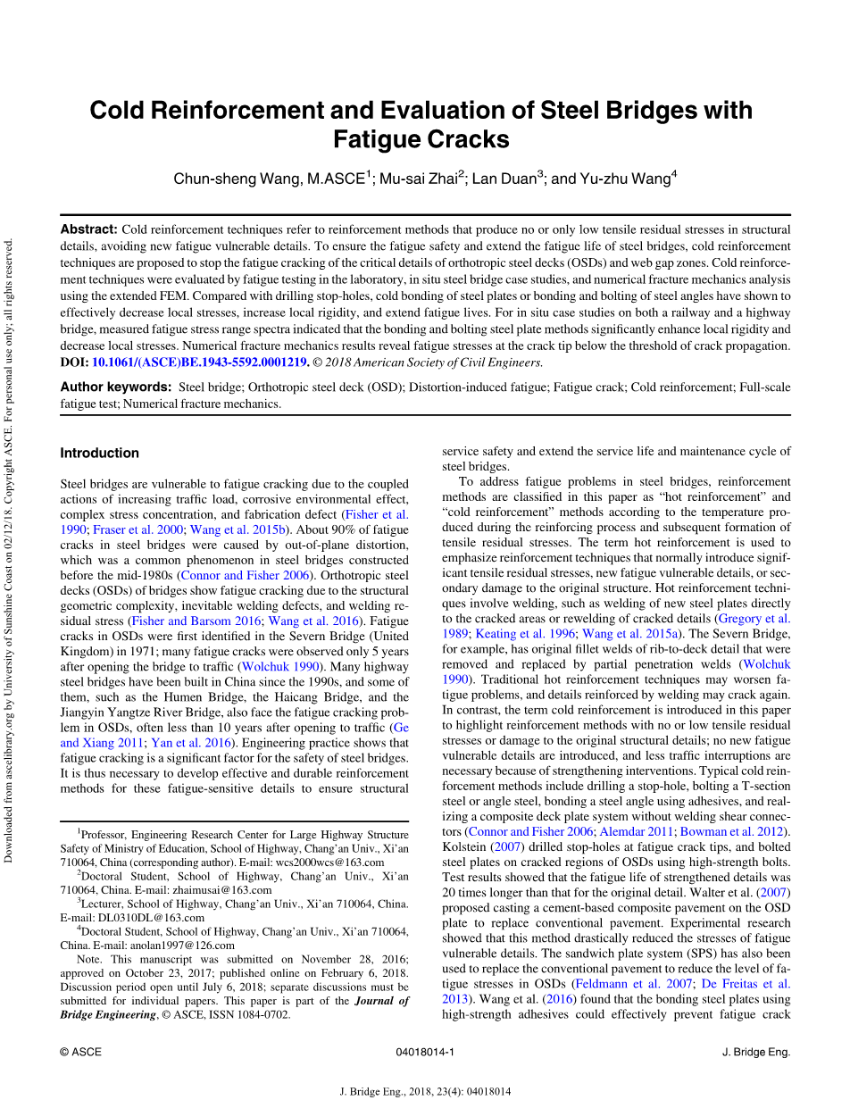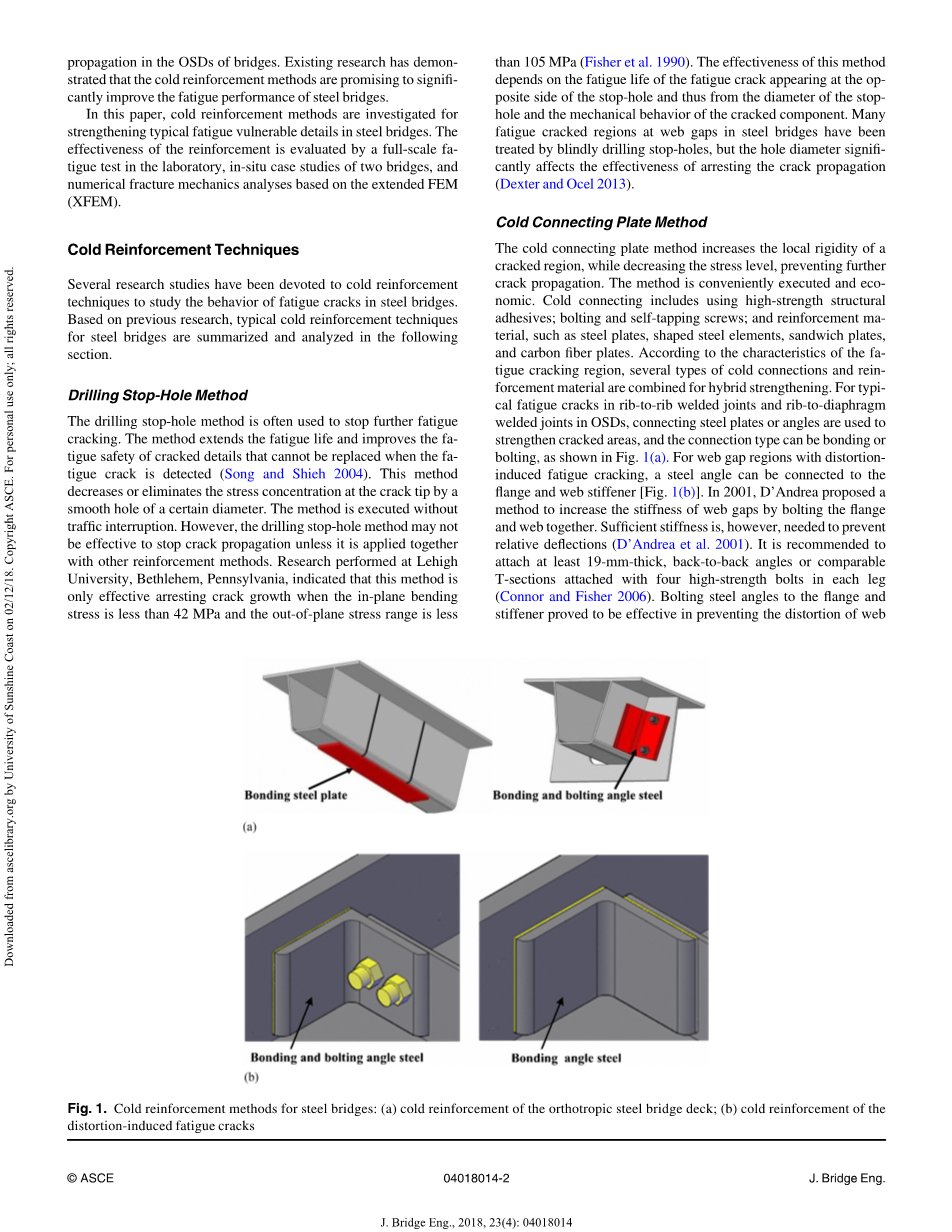 Wang等人(2016年)发现使用高强度粘合剂粘合钢板可有效防止疲劳裂纹在桥的正交各向异性钢桥面板中传播。已有研究表明,采用冷加固方法可以显著提高钢桥的疲劳性能。本文研究了钢桥典型疲劳薄弱部位的冷加固方法。通过实验室全尺寸疲劳试验、两座桥梁的现场案例研究以及基于扩展有限元的断裂力学数值分析,评估了加固效果(XFEM)。