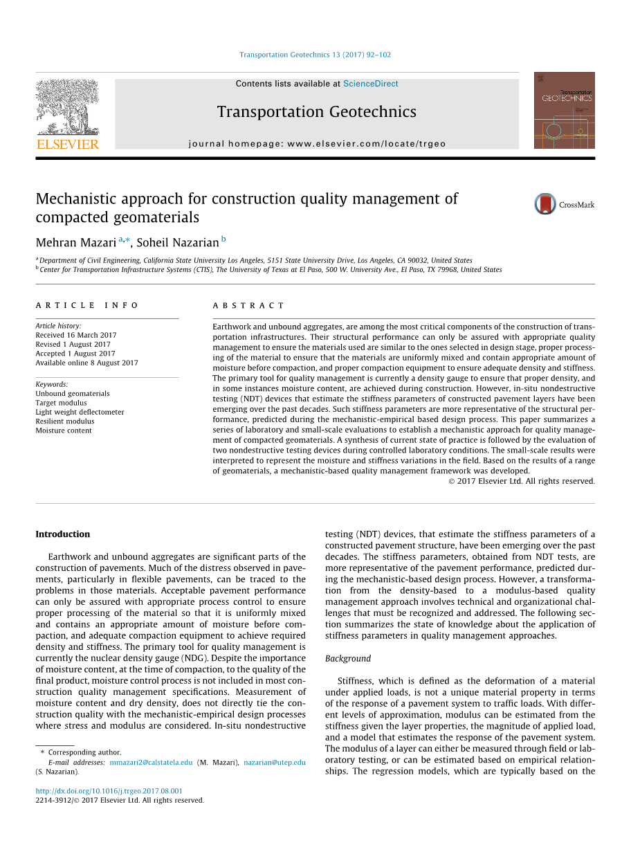 土方工程和松散集料是交通基础设施建设中最关键的组成部分。合理的质量管理体系能保证其结构性能,确保所用材料与设计阶段所选材料相似,能对材料进行适当的加工;确保材料在压实前均匀混合并含有适当的水分,能采用相应的压实设备来保证其有足够的密度和刚度。目前质量管理的主要工具是密度计,用来确保在施工过程中达到适当的密度,或者某些情况下达到合理的含水量。但是,在过去的几十年中,用于估算已施工路面层刚度参数的原位无损检测(NDT)装置不断涌现。在基于力学-经验法的设计过程中,这些刚度参数更能代表结构的性能。本文总结了一系列的室内和小型评估的成果,以建立压实岩土材料施工质量管理的力学方法。综合目前的实践情况,然后在受控室内条件下对两种无损检测设备进行评估。小范围实验的结果被认为是现场湿度和刚度的变化。基于这一系列岩土材料的结果,开发了一个基于力学的质量管理框架。